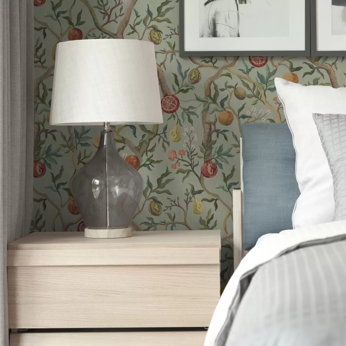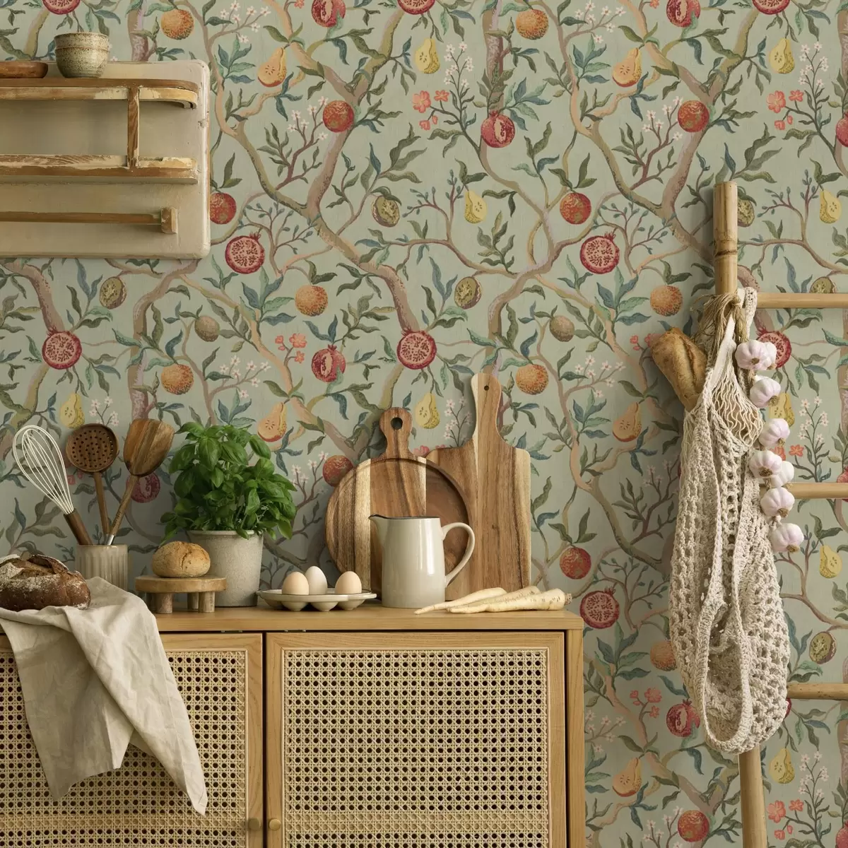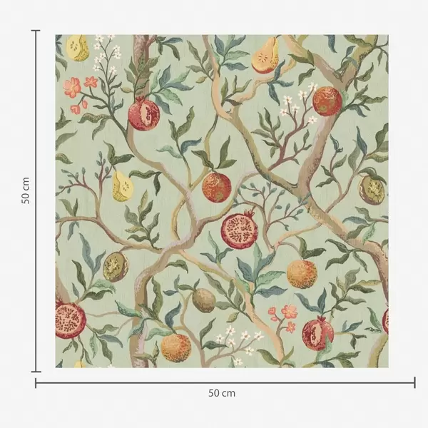 Tapetti Granaattiomenan hedelmiä, päärynöitä ja kukkia vaaleanvihreällä pohjalla Nr. a00465
