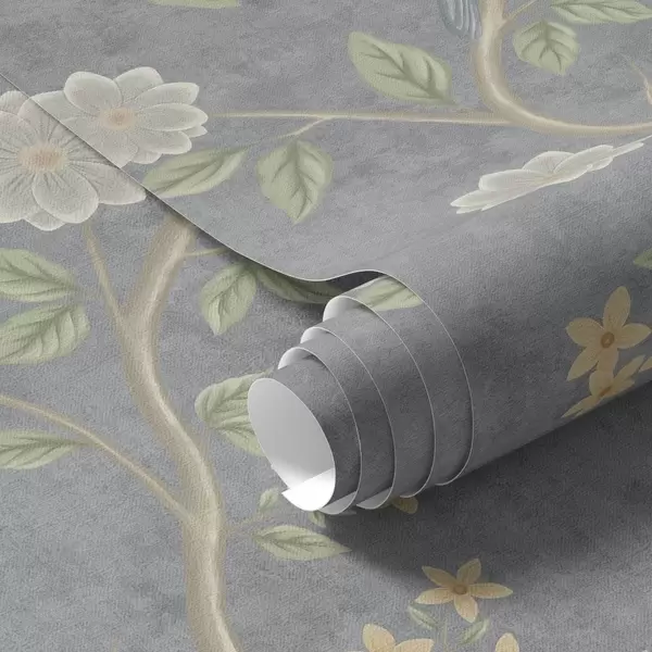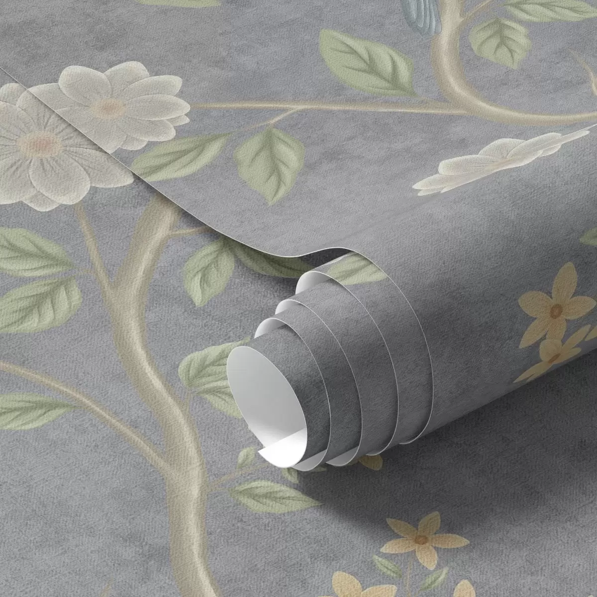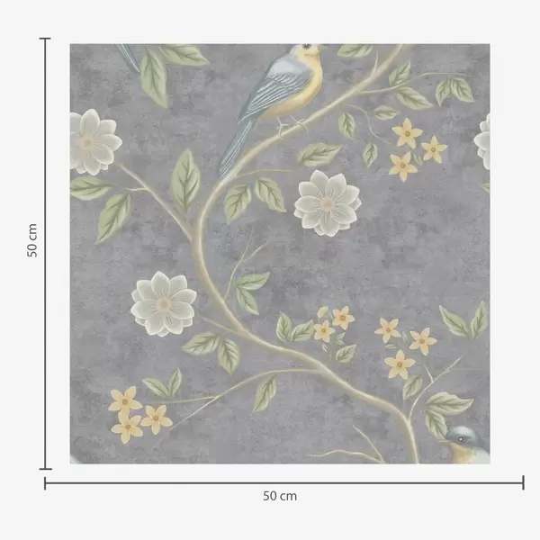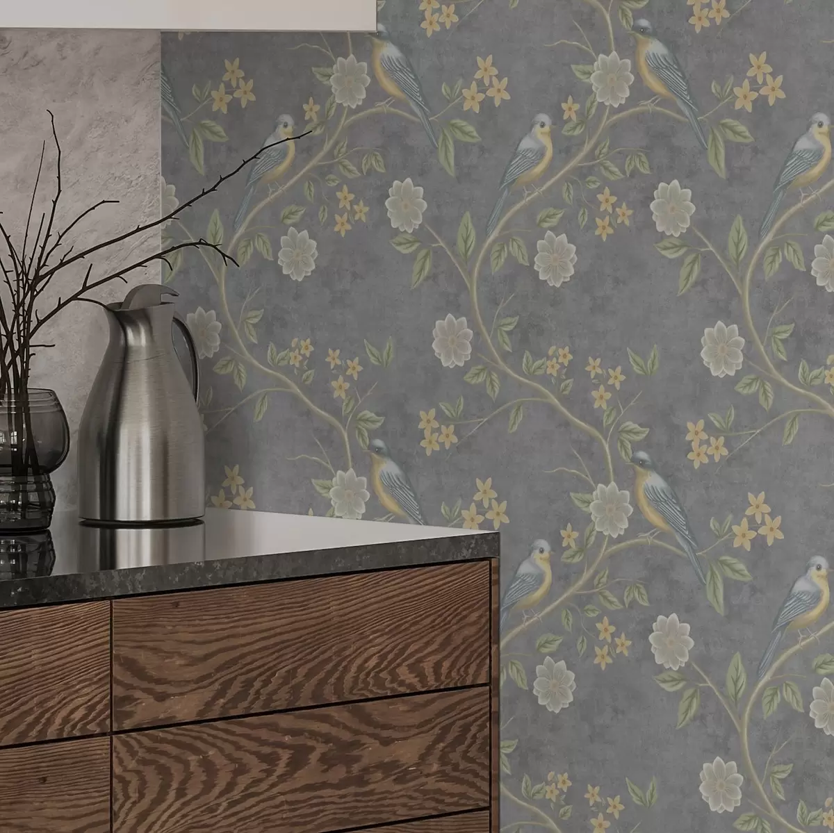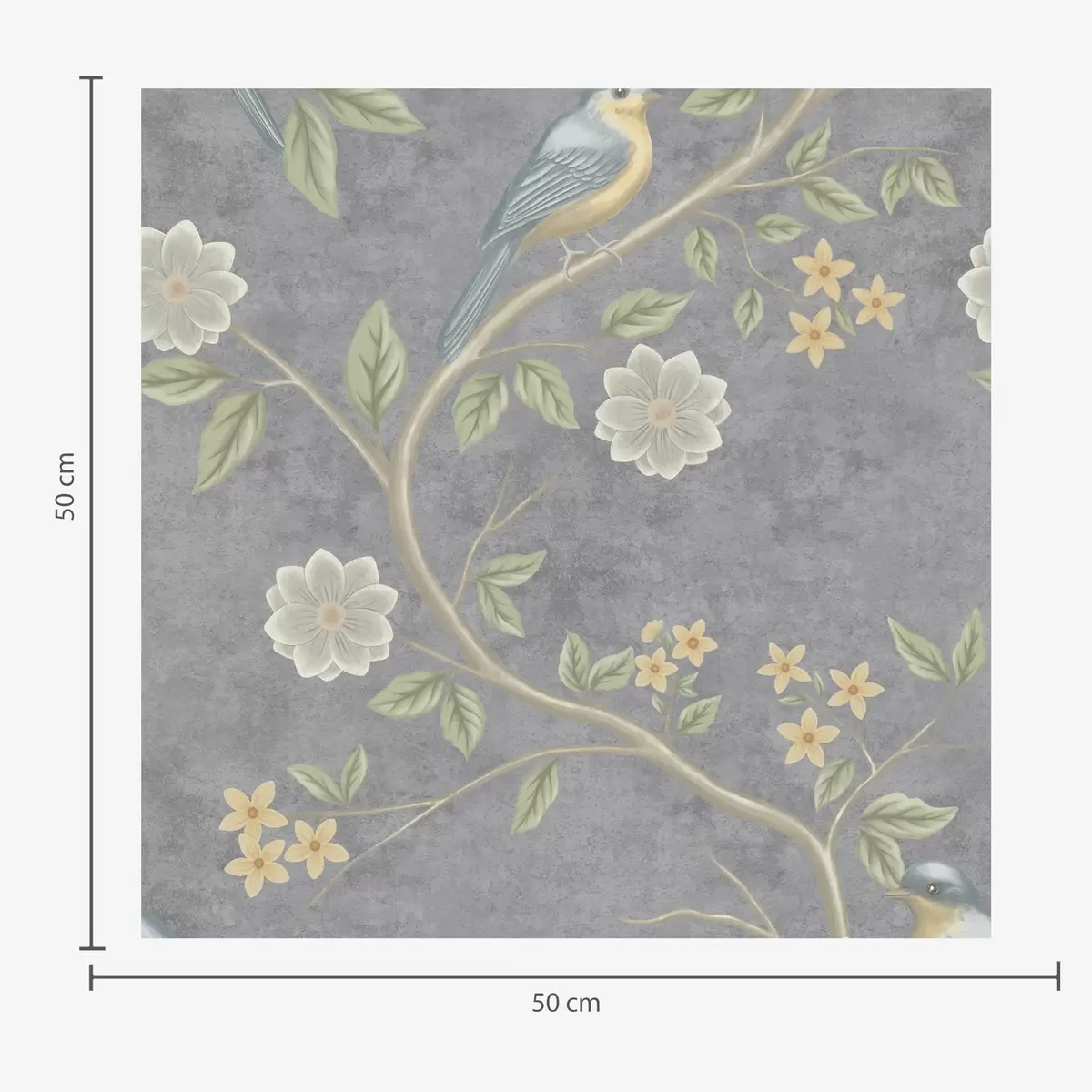 Tapetti Linnut oksilla kukkien keskellä harmaalla taustalla Nr. a00483