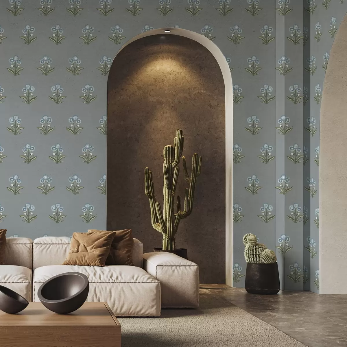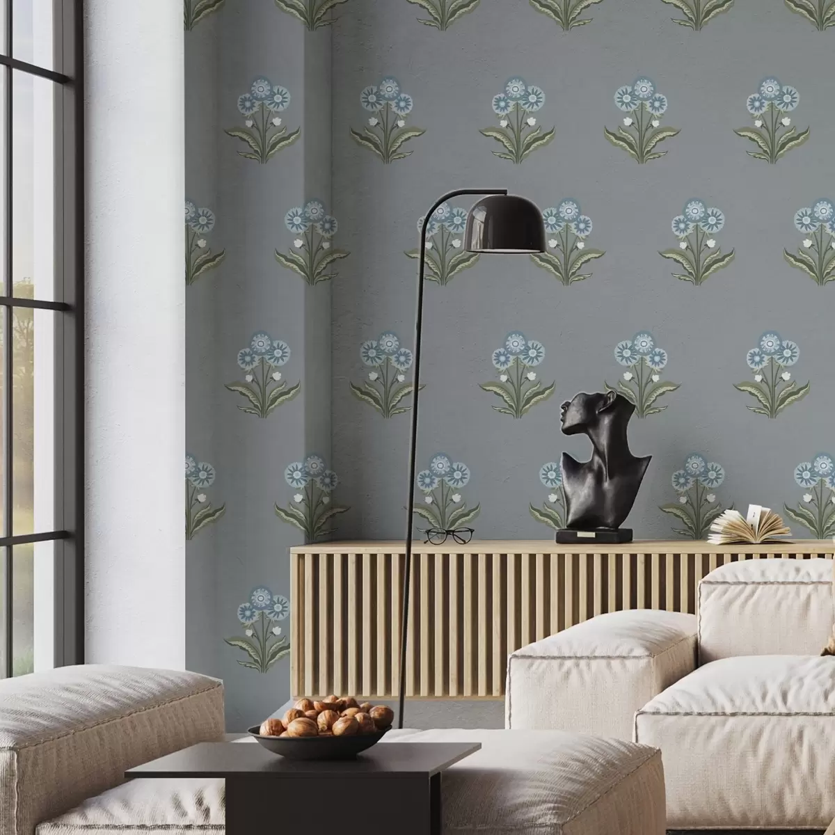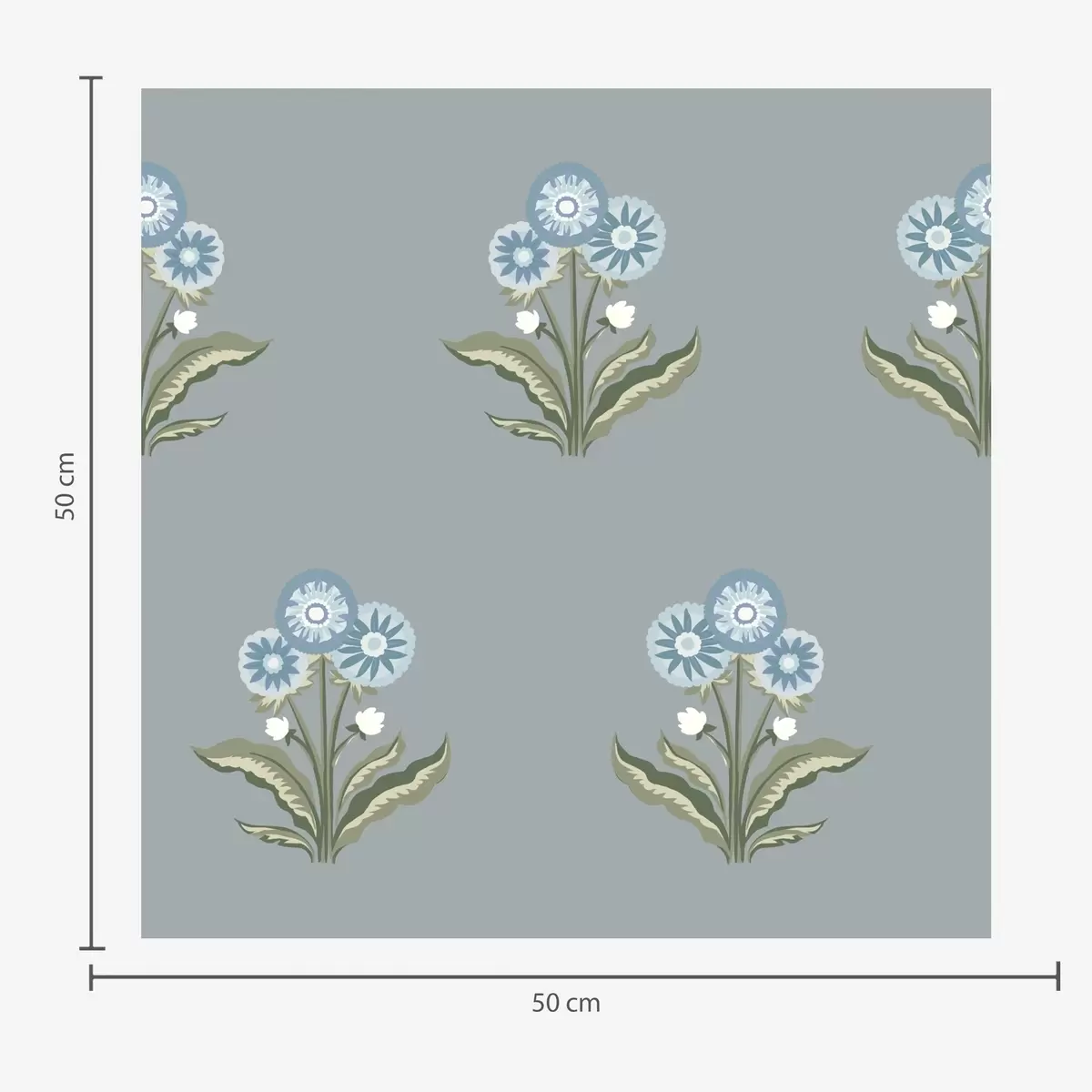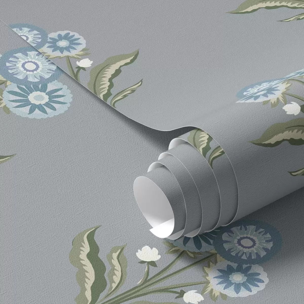 Tapetti Tyylitellyt kukat harmaansinisellä taustalla, viileä värimaailma Nr. a00494v1