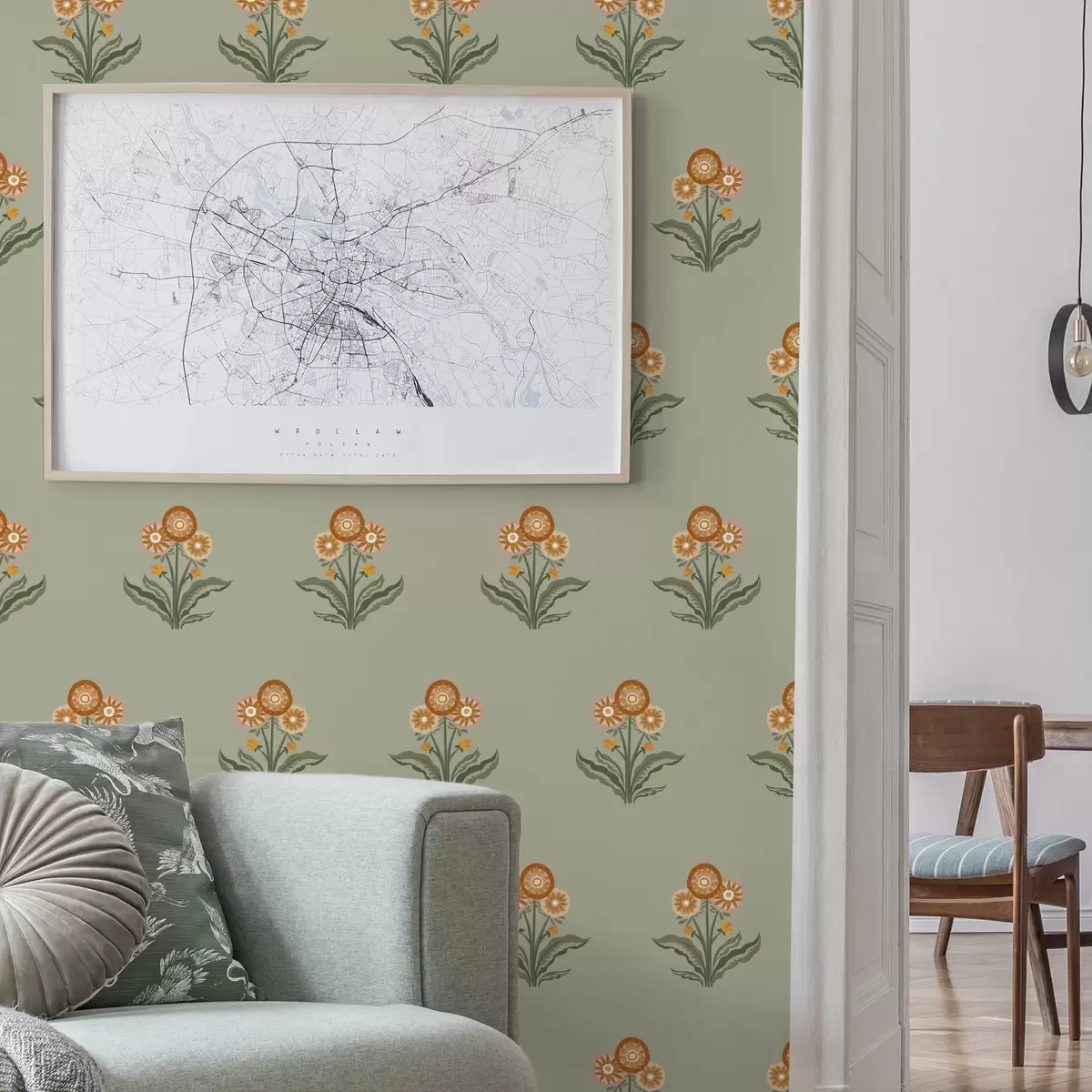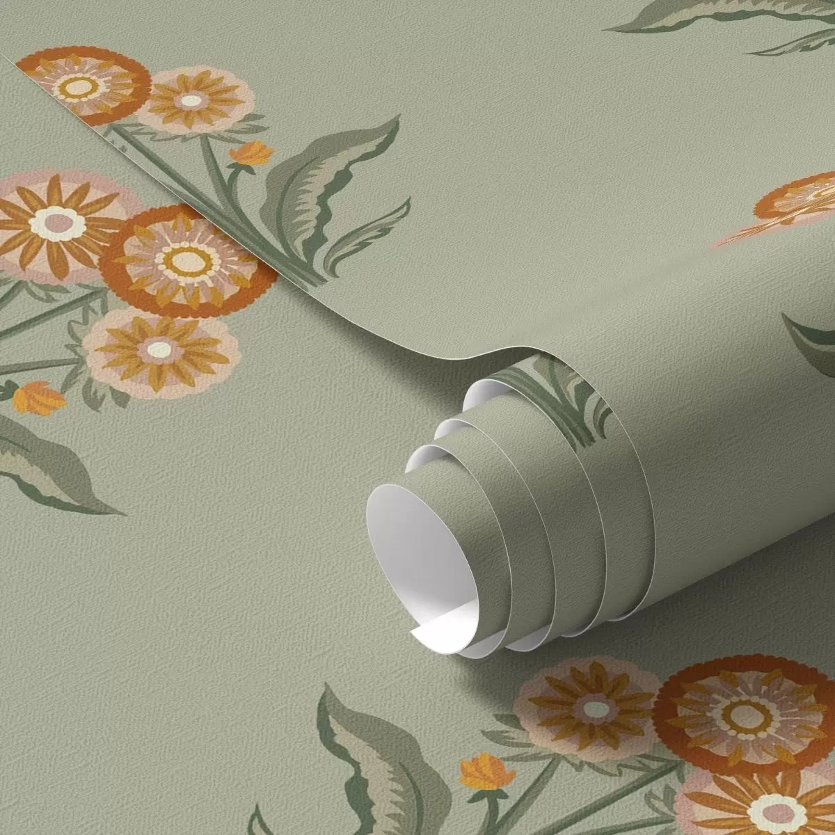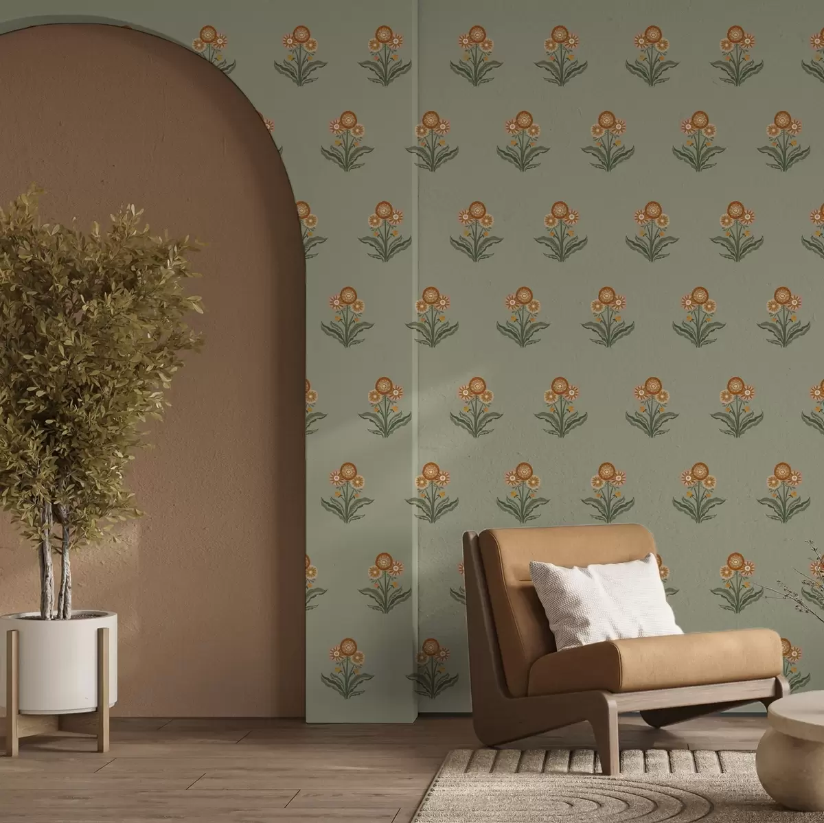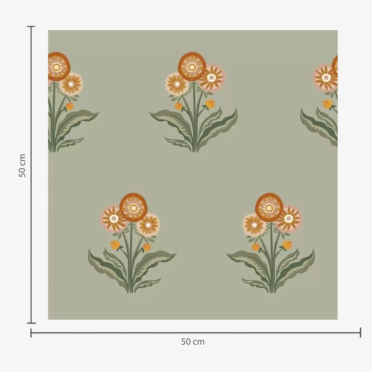 Tapetti Tyylitellyt kukat oliivinvärisellä taustalla, lämpimät sävyt Nr. a00494v2