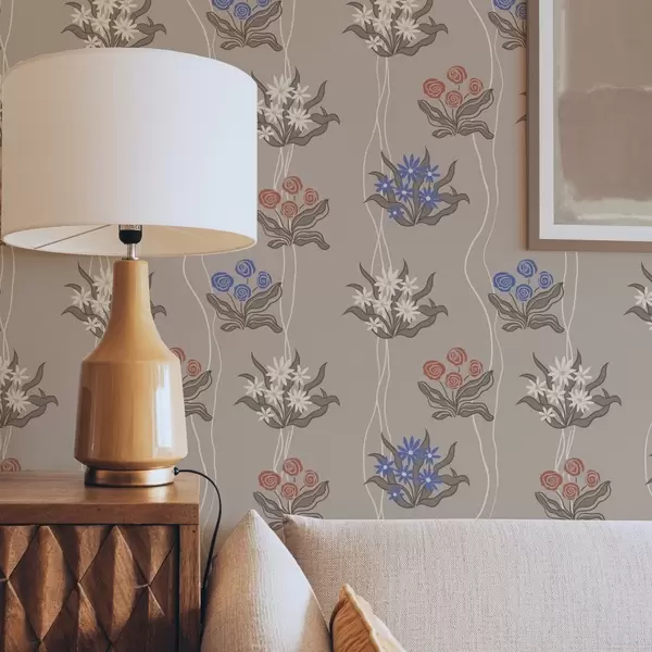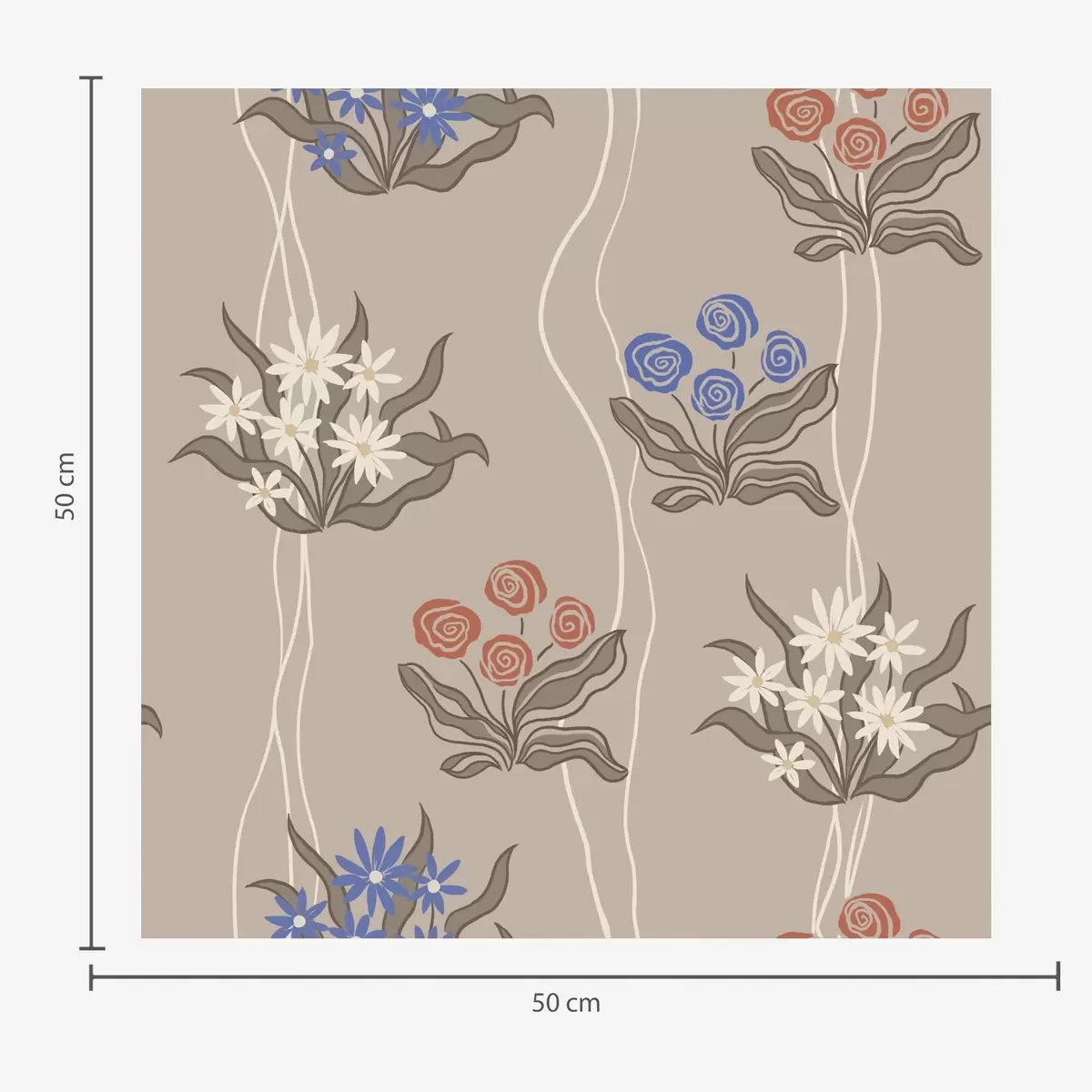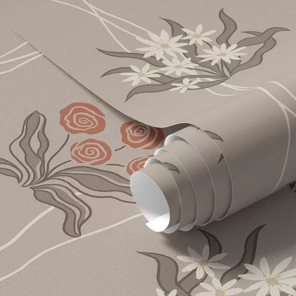 Tapetti Retro-kukat aaltoilevilla viivoilla lämpimällä beige-taustalla Nr. a00503