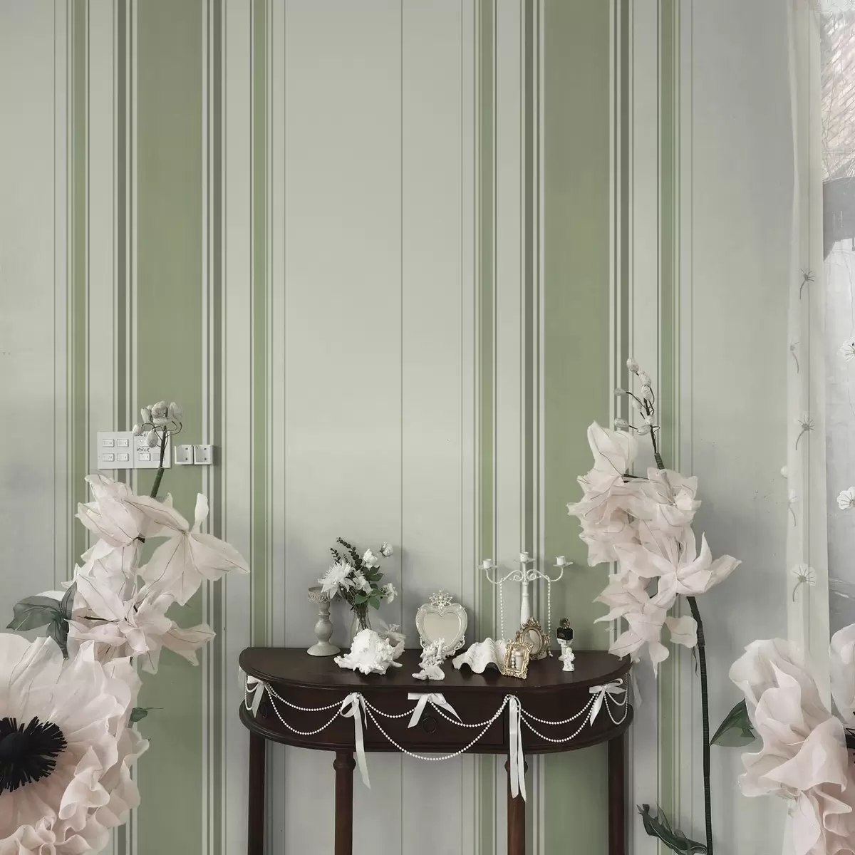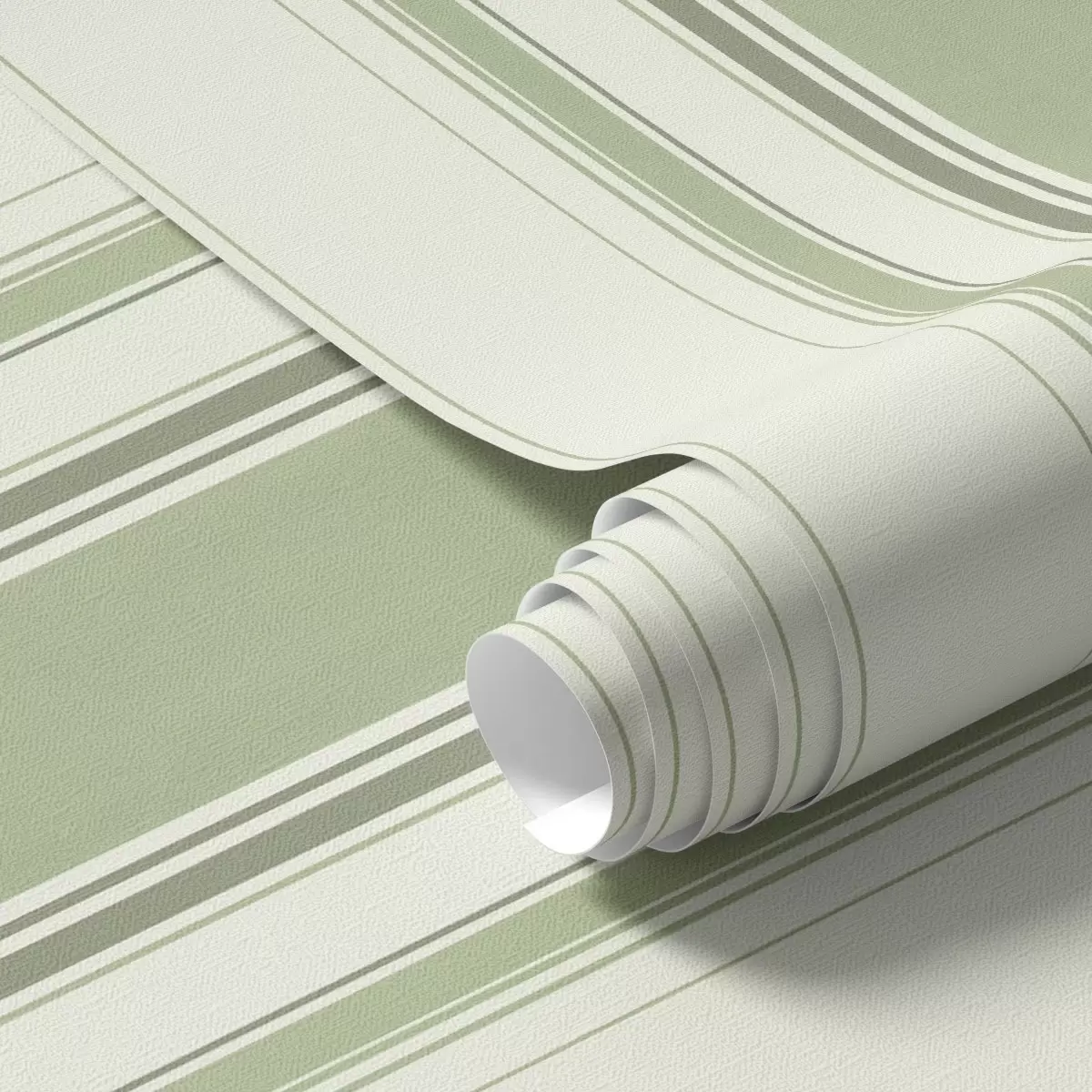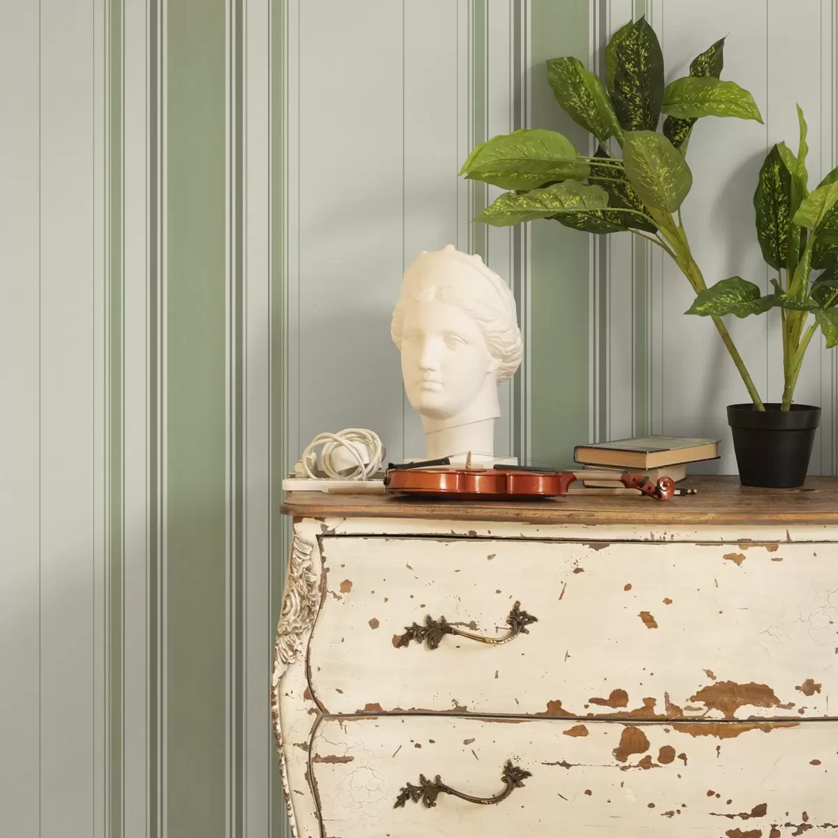 Tapetti Kermanvärinen tausta, jossa on leveä vihreä keskiraita Nr. a00519