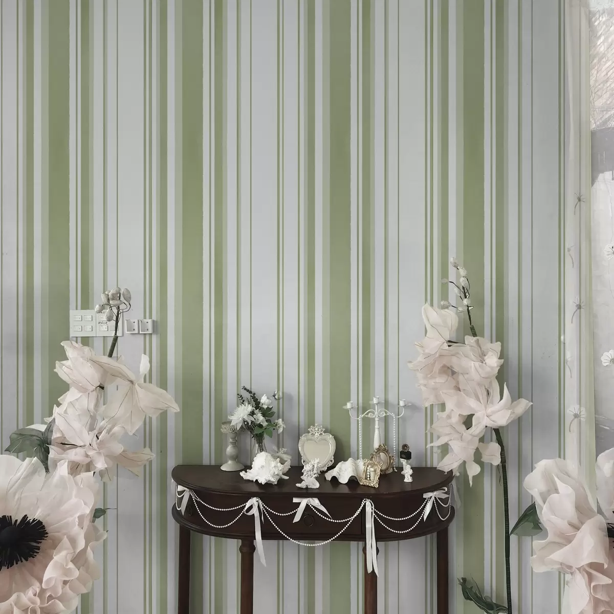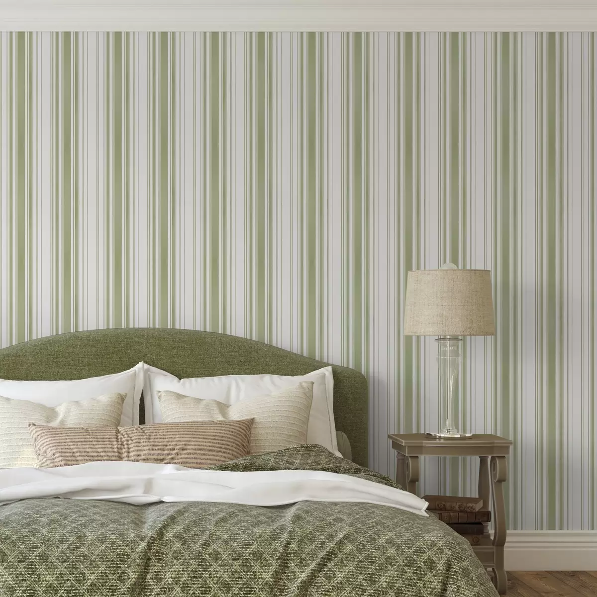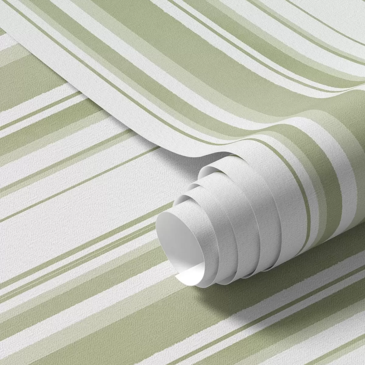 Tapetti Vihreät vaihtelevan levyiset raidat vaalealla pohjalla Nr. a00523