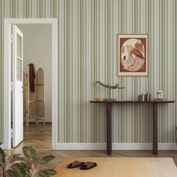 Tapetti Kermanvärinen tausta, jossa harmaa-beige pystysuorat raidat Nr. a00564