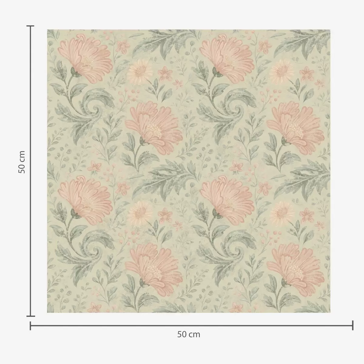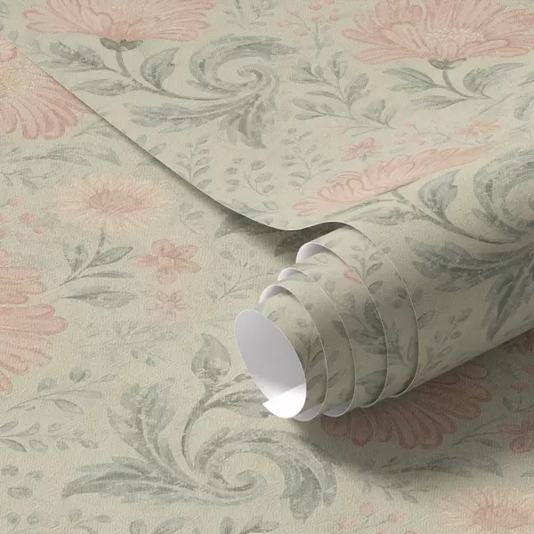 Tapetti Vintage-tyyliset suuret persikkakukat salvia-lehdillä Nr. a00580