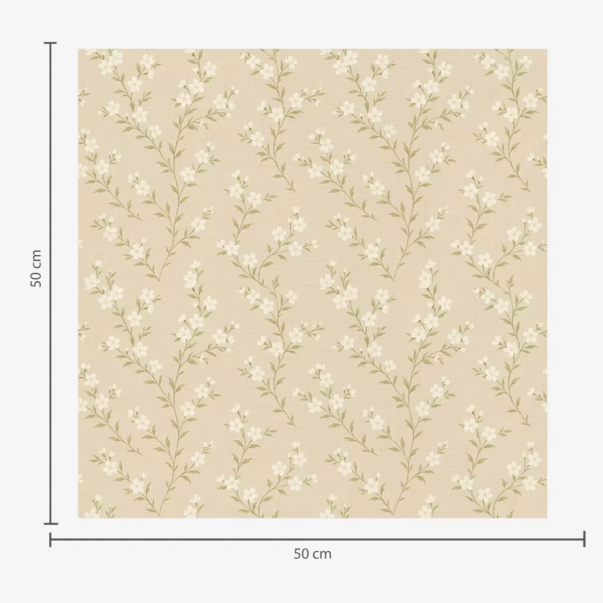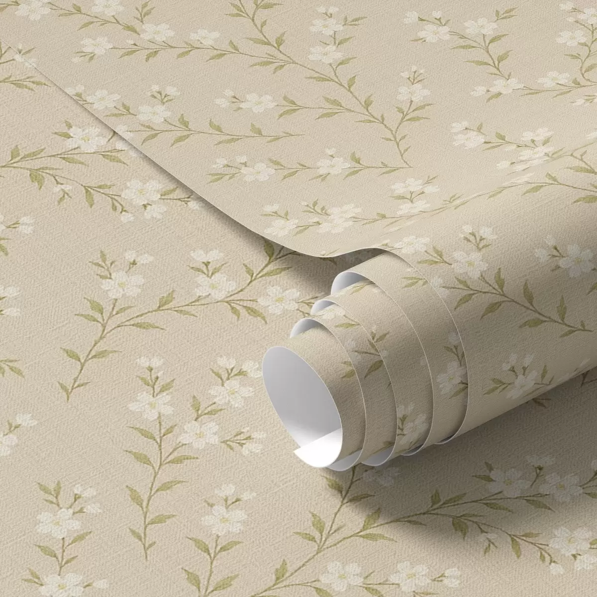 Tapetti Pienet valkoiset oksat beige-värisellä pellavakankaalla Nr. a00584