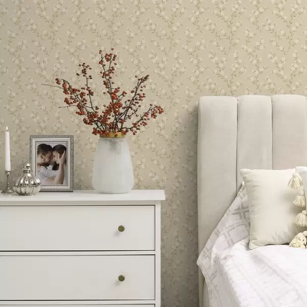 Tapetti Pienet valkoiset oksat beige-värisellä pellavakankaalla Nr. a00584
