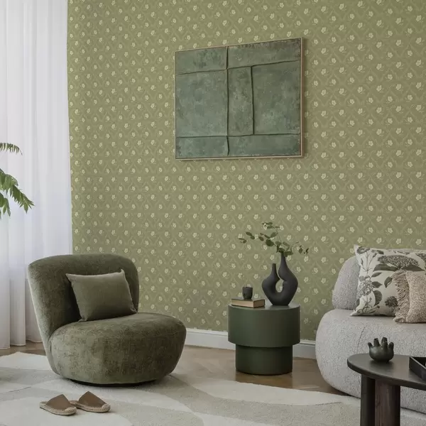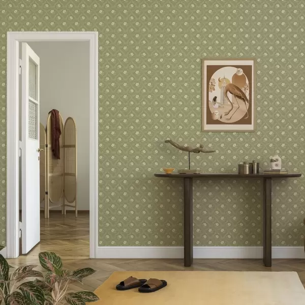Tapetti Oliivipuu trellis kermanvärisillä kukilla, retrokoriste Nr. a00585