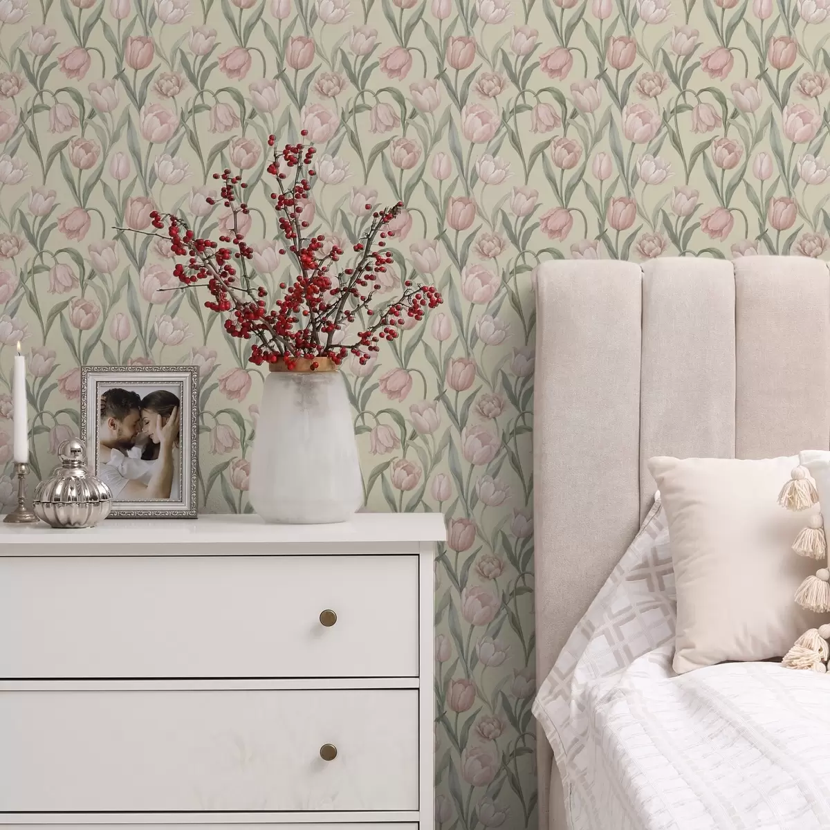 Tapetti Pehmeän vaaleanpunaiset tulppaanit lempeällä beige-taustalla Nr. a00589