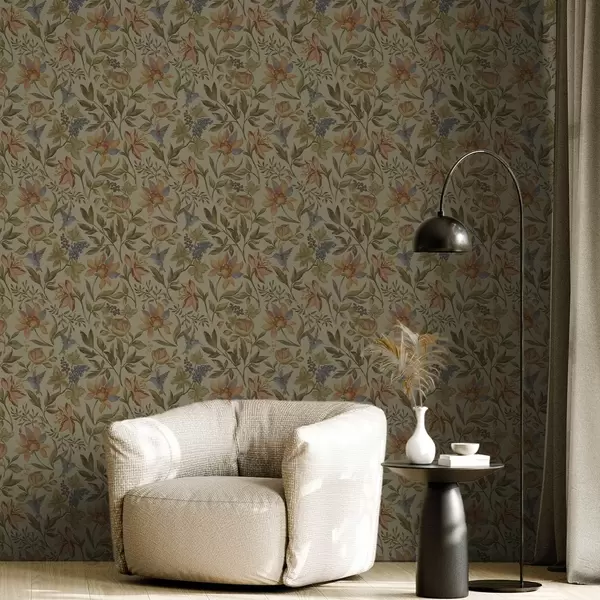Tapetti Vintage-kukat ja linnut viinirypäleiden kanssa oliivinvihreällä taustalla Nr. a00594