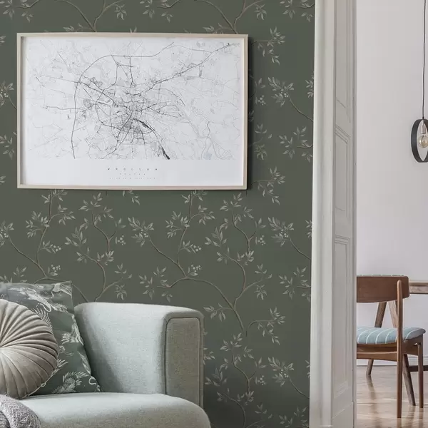 Tapetti Hienostuneet lehtiset oksat tummanvihreällä taustalla Nr. a00597