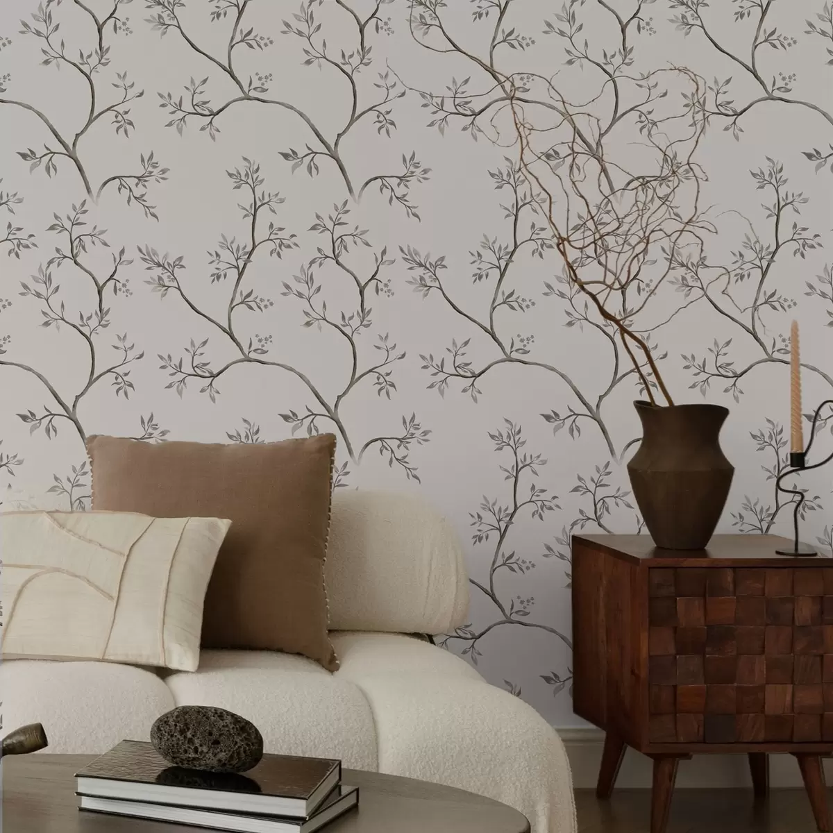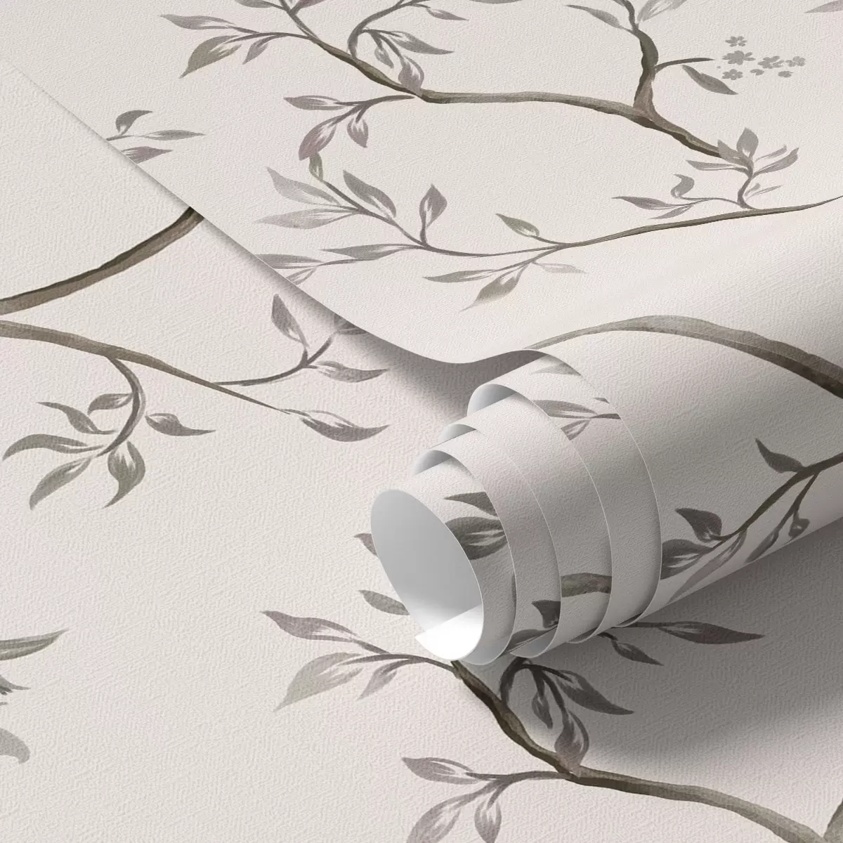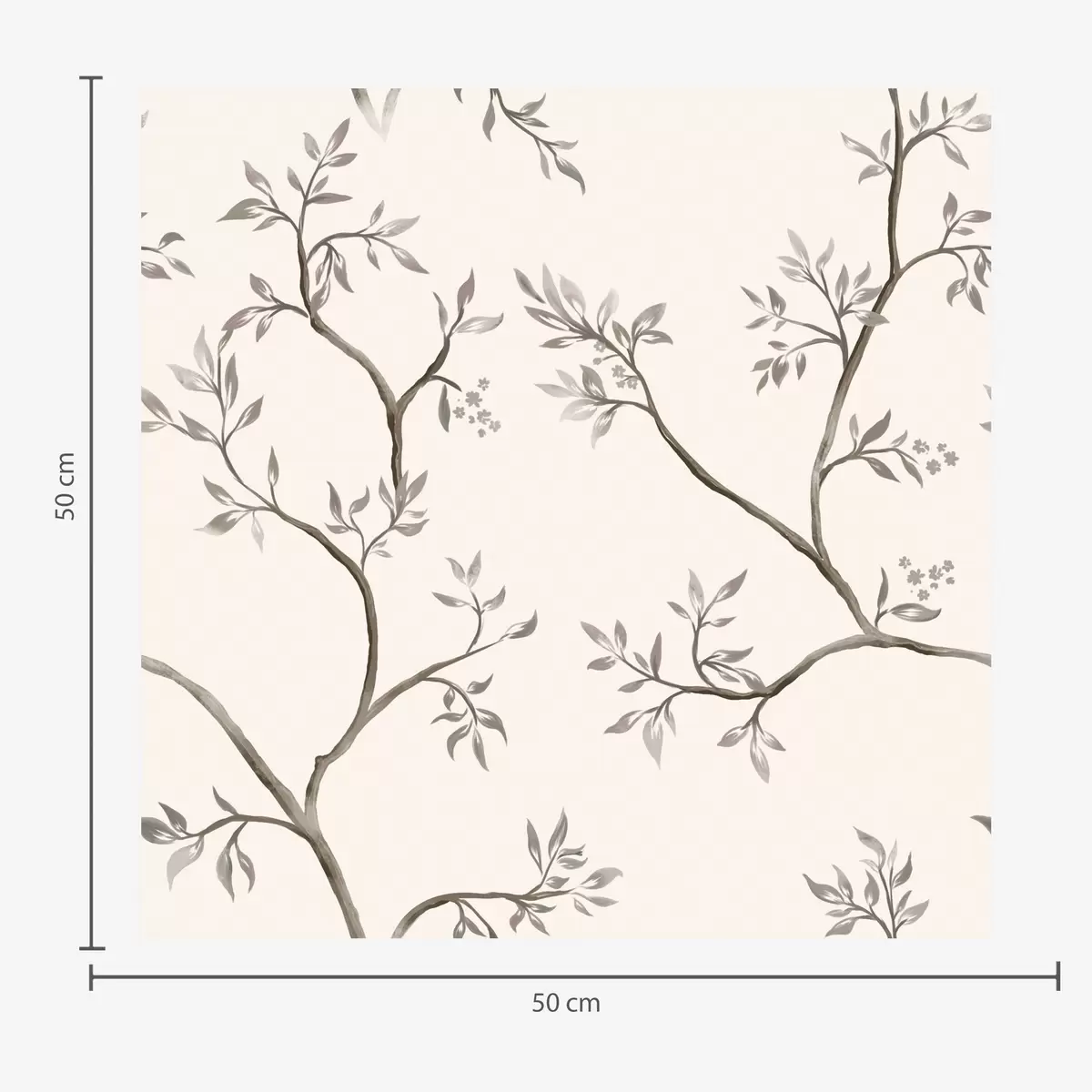 Tapetti Hienostuneet lehtiset oksat lämpimällä kermanvärisellä taustalla Nr. a00597v1