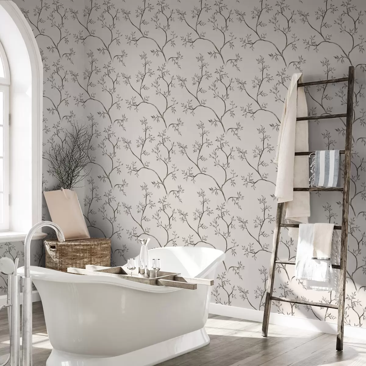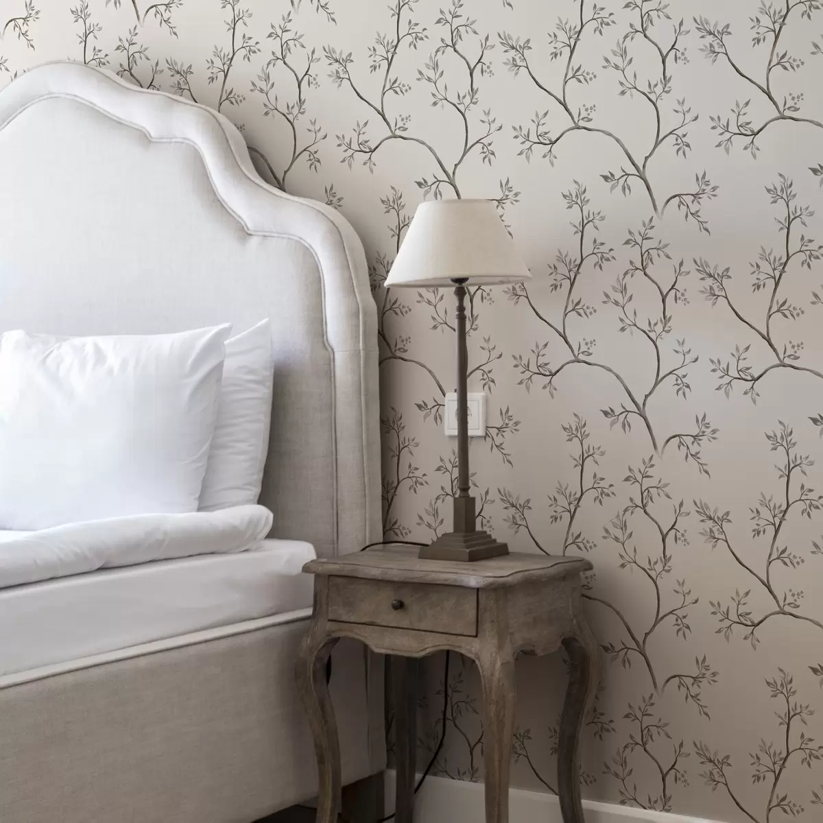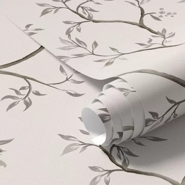 Tapetti Hienostuneet lehtiset oksat lämpimällä kermanvärisellä taustalla Nr. a00597v1