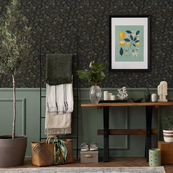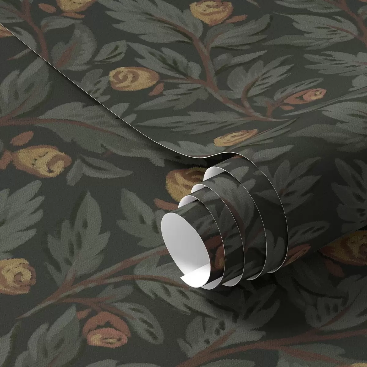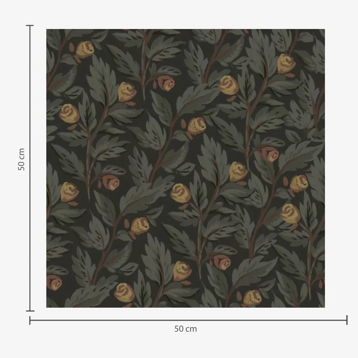 Tapetti Tumma kukkakuvio, jossa on keltaisia silmuja ja lehtiä Nr. a00598