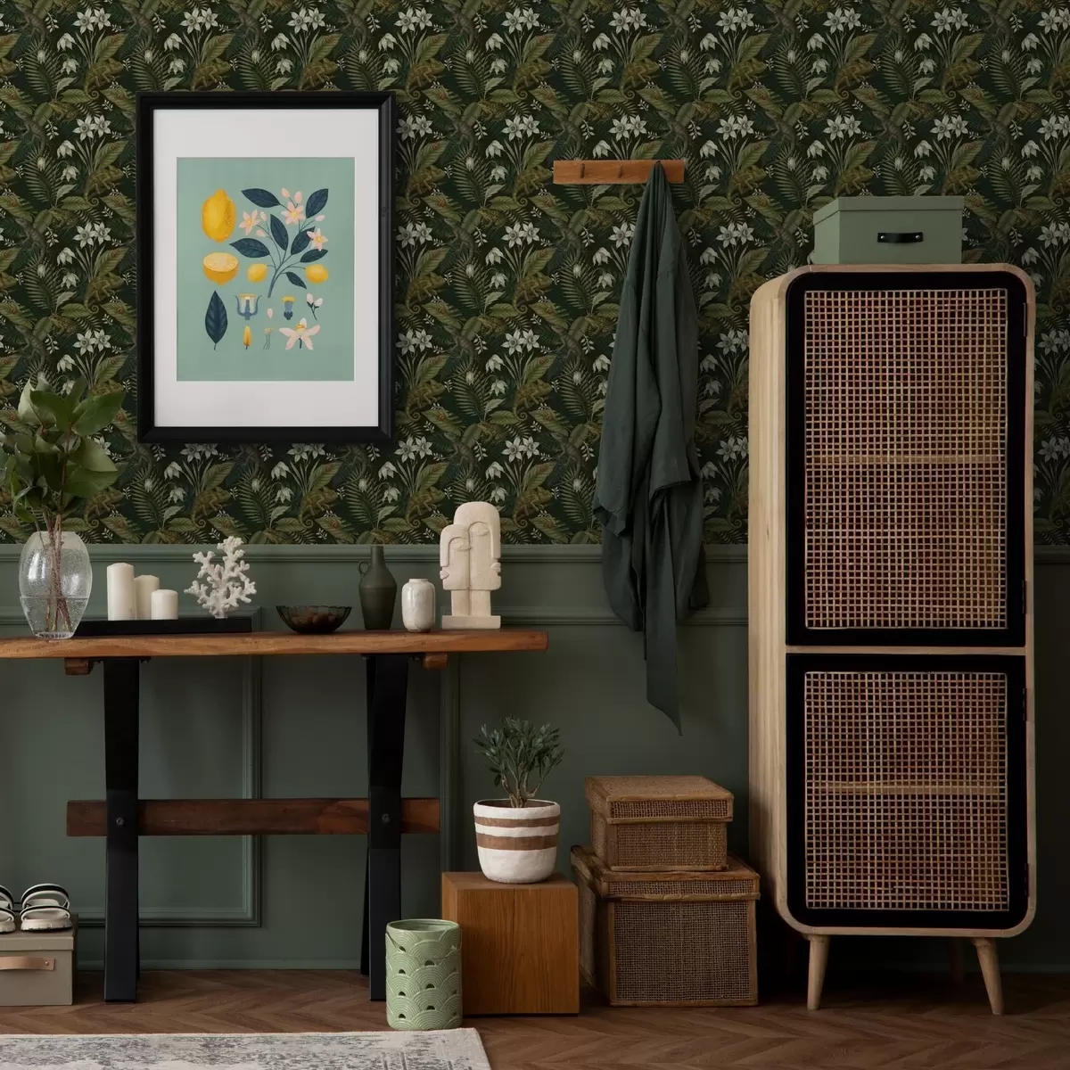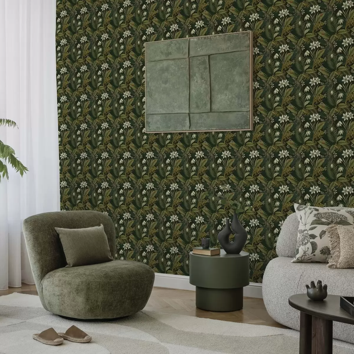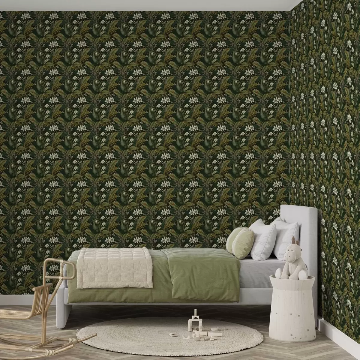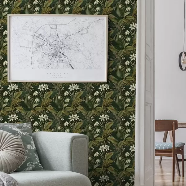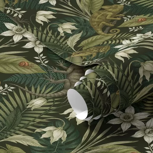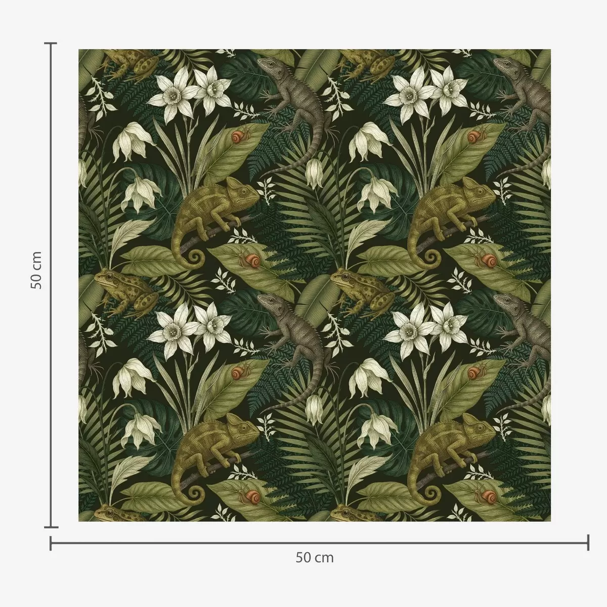 Tapetti Kameleontit ja trooppiset lehdet, valkoiset kukat, tumma tausta Nr. a00608v1