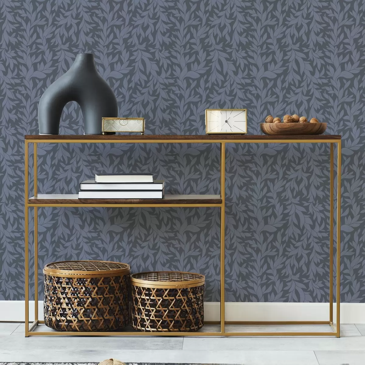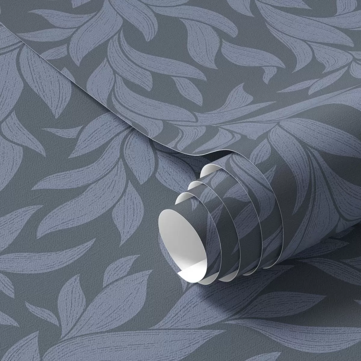 Tapetti Grafiittisininen tausta ja siniset lehdet, teksturoitu viiva Nr. a00616v2