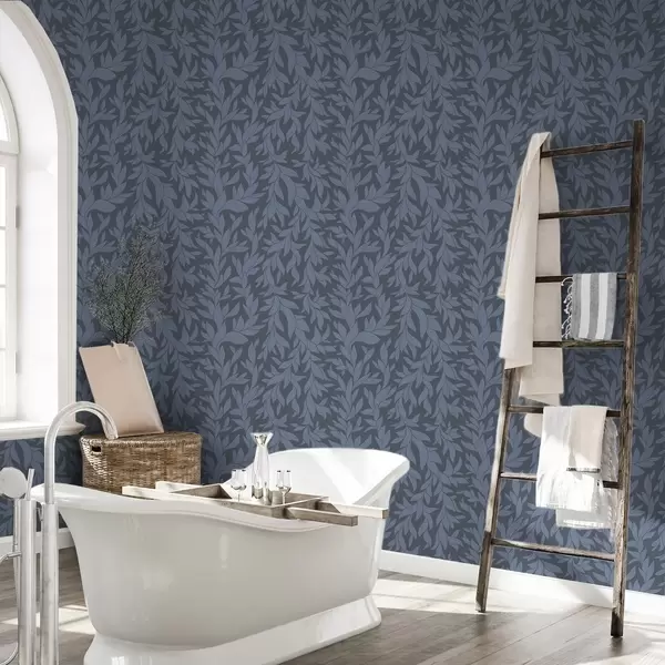Tapetti Grafiittisininen tausta ja siniset lehdet, teksturoitu viiva Nr. a00616v2