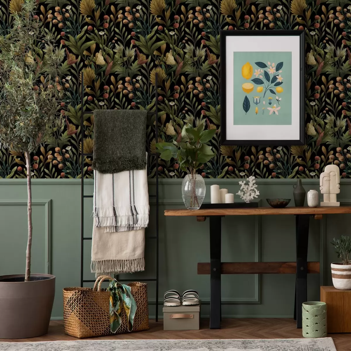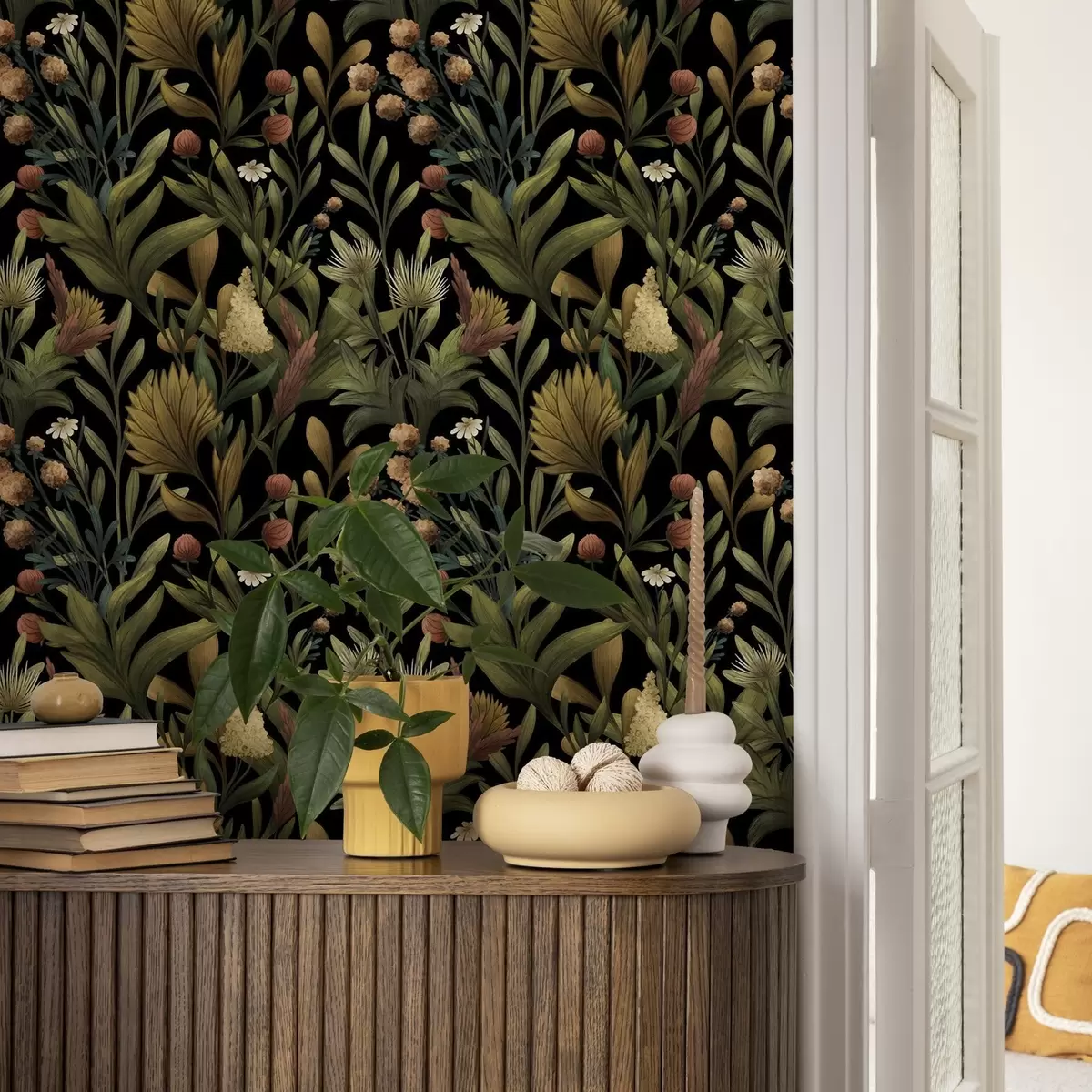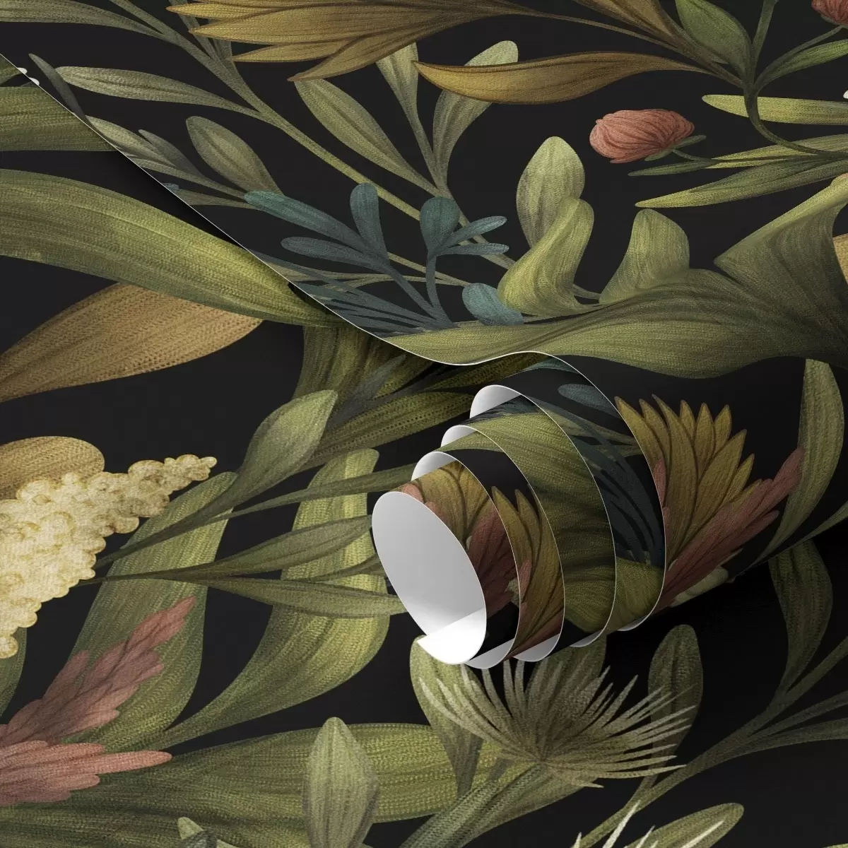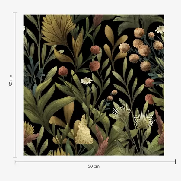 Tapetti Kasvitieteellinen puutarha mustalla taustalla, lämmin syksyn väripaletti Nr. a00619