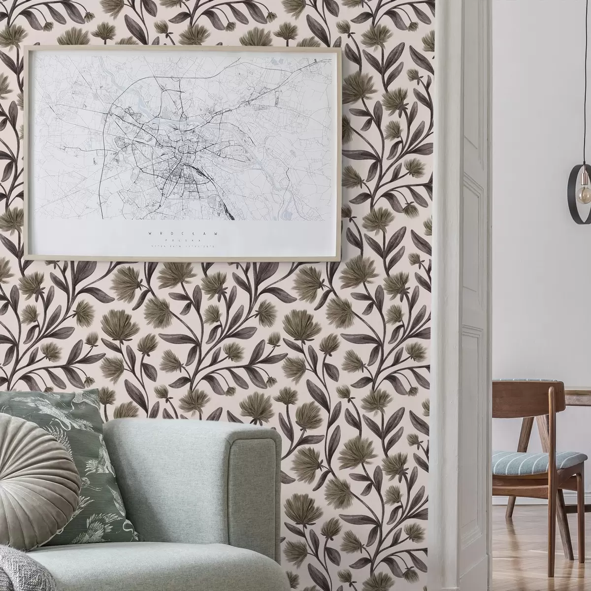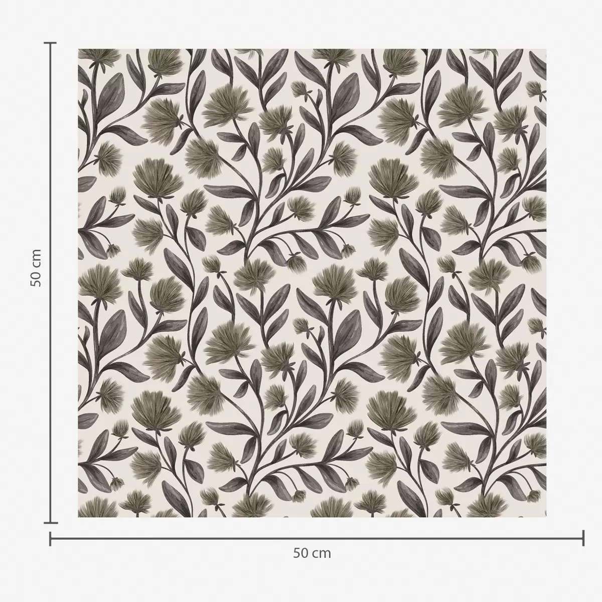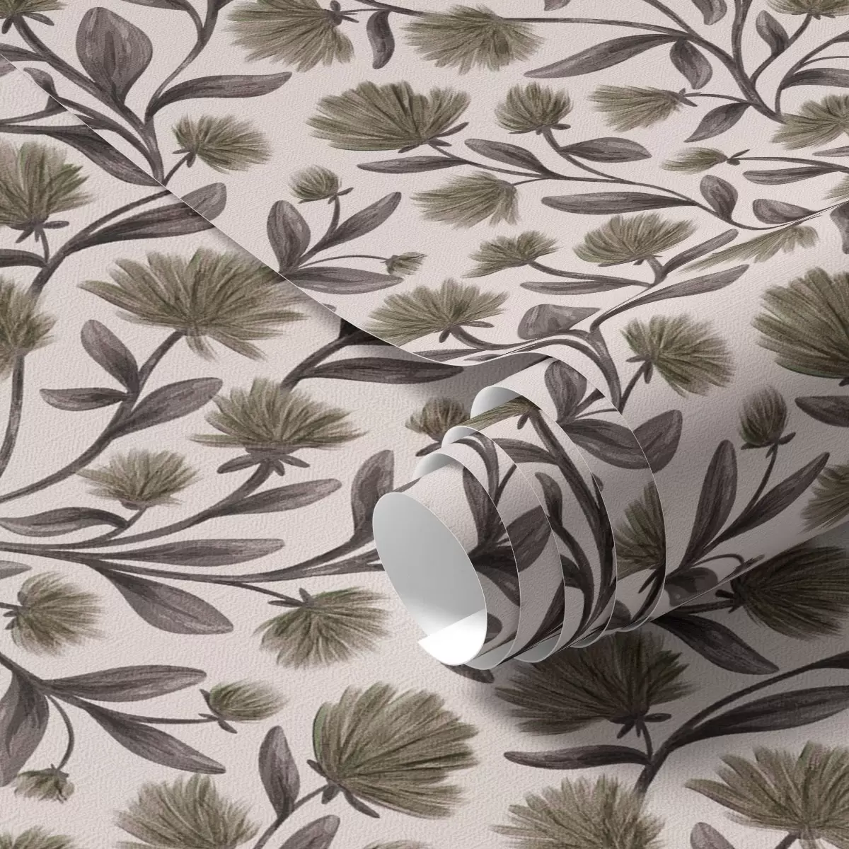 Tapetti Kermavärisellä pohjalla harmahtavan oliivinvärisiä luonnonkukkia Nr. a00623v1