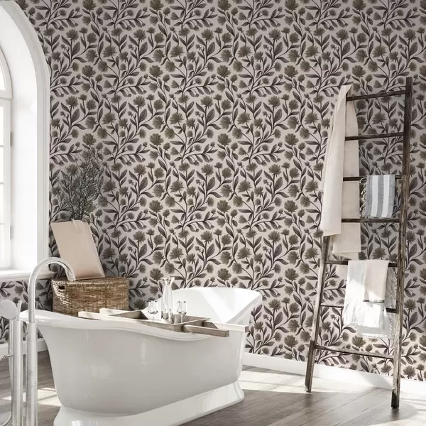 Tapetti Kermavärisellä pohjalla harmahtavan oliivinvärisiä luonnonkukkia Nr. a00623v1