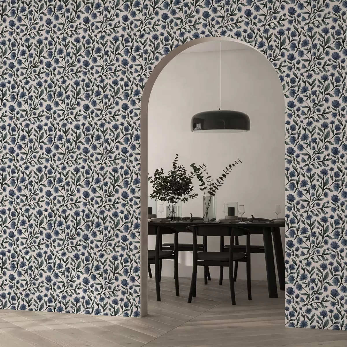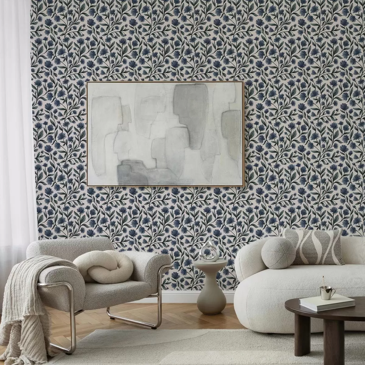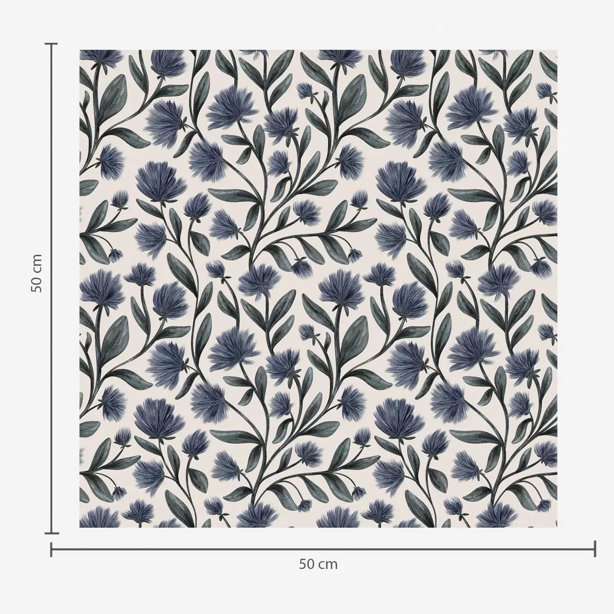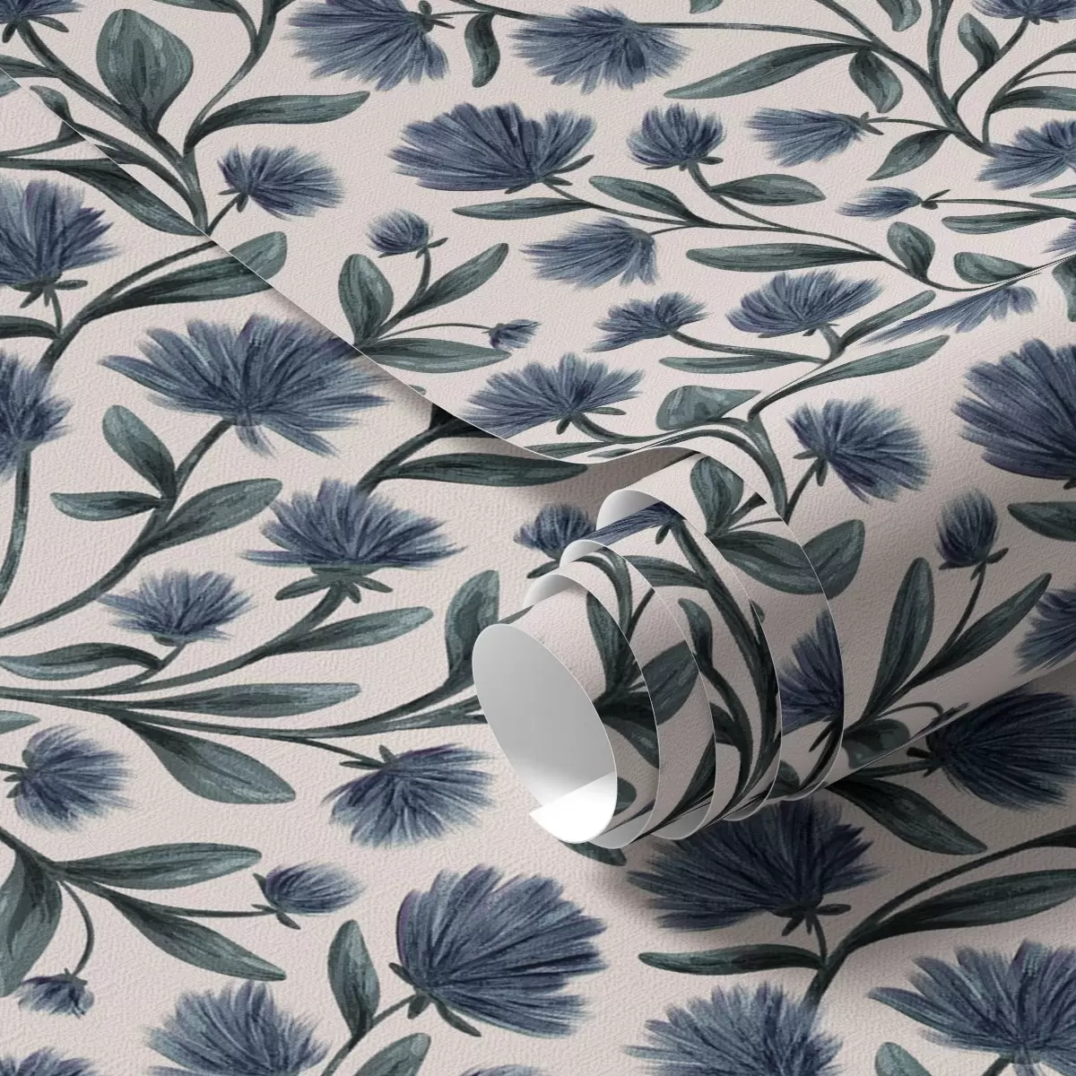 Tapetti Sinivihreän sävyiset luonnonkukat kermanvärisellä taustalla Nr. a00623v2