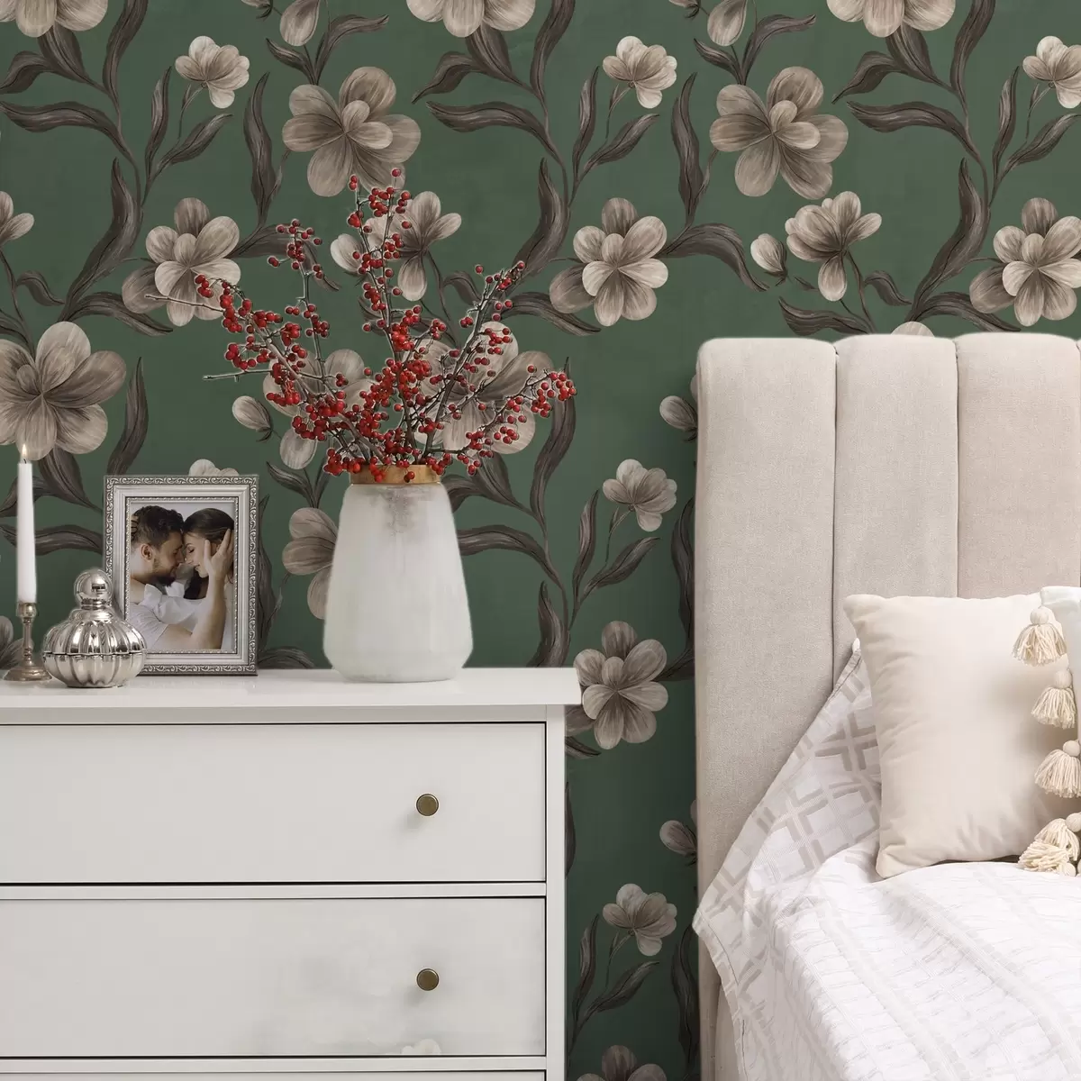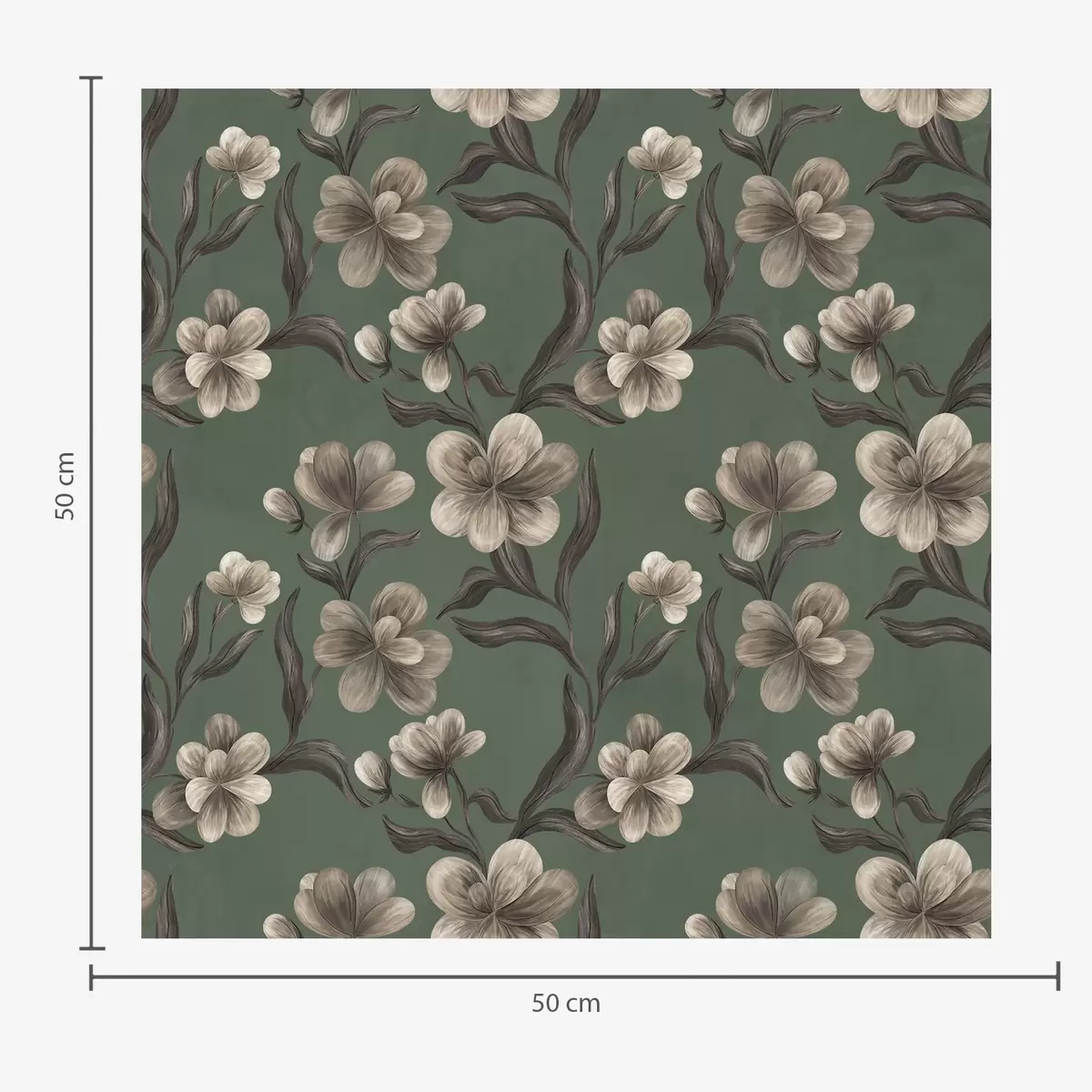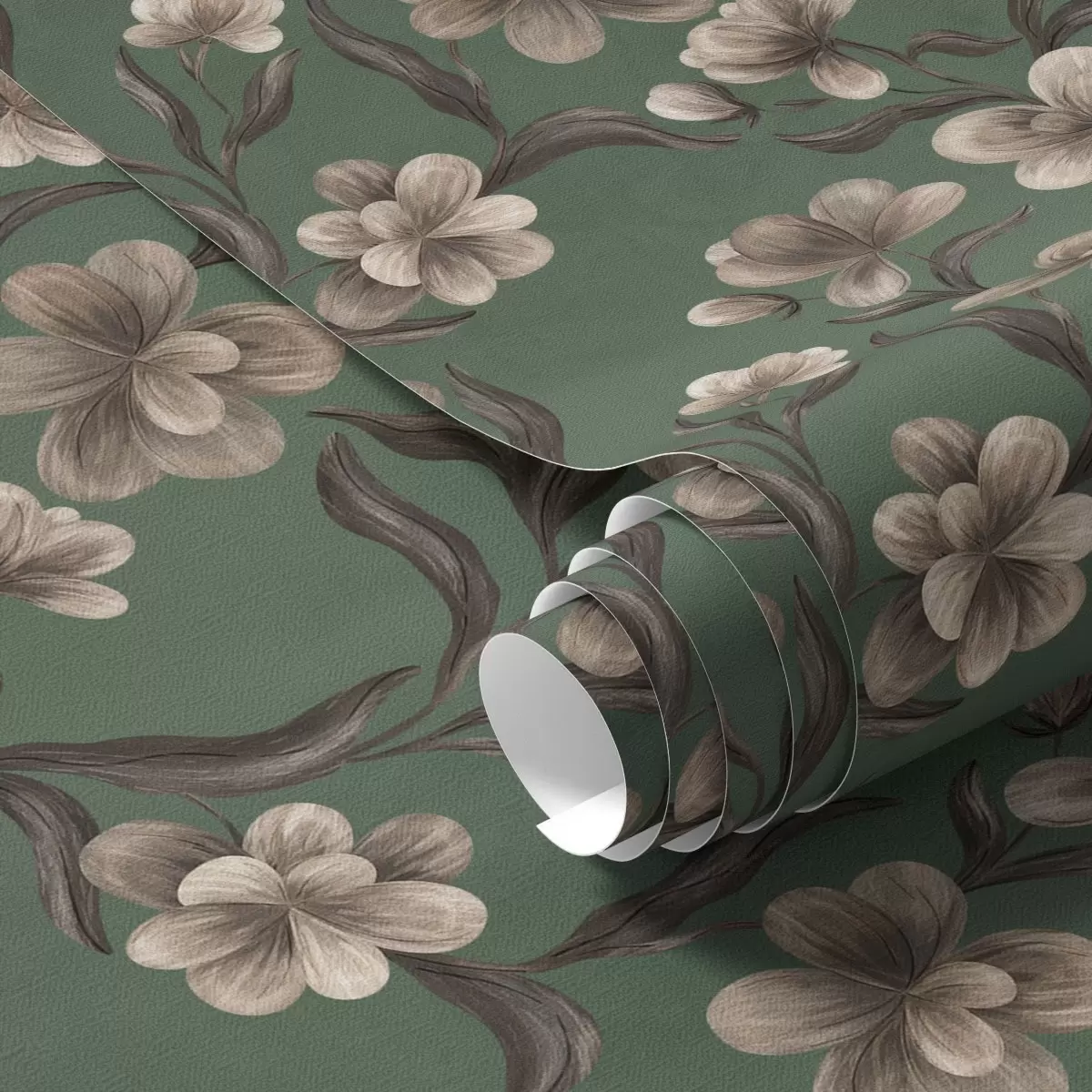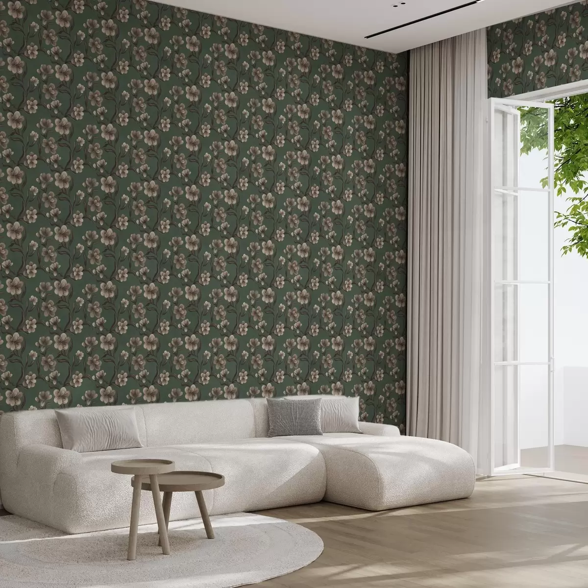 Tapetti Beigenväriset kukat syvän vihreällä taustalla Nr. a00626v3