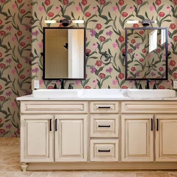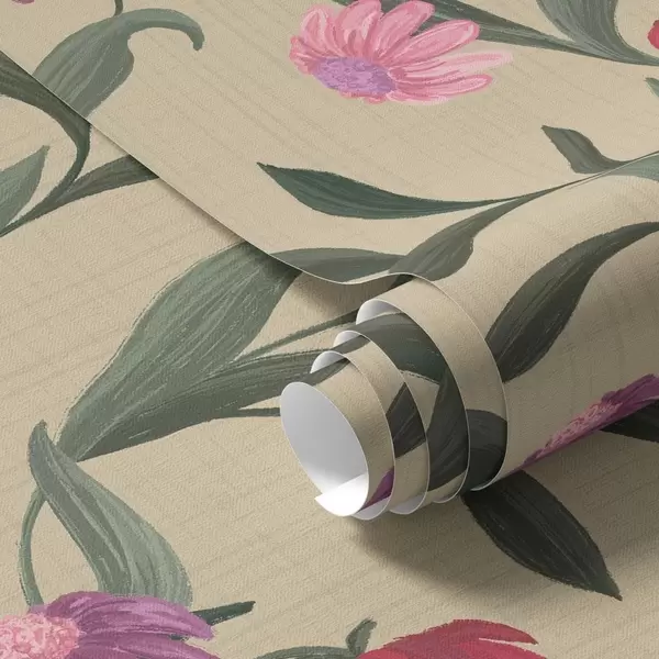 Tapetti Vaaleanpunaiset kukat beige-taustalla, käsin piirretty tekstuuri Nr. a00631