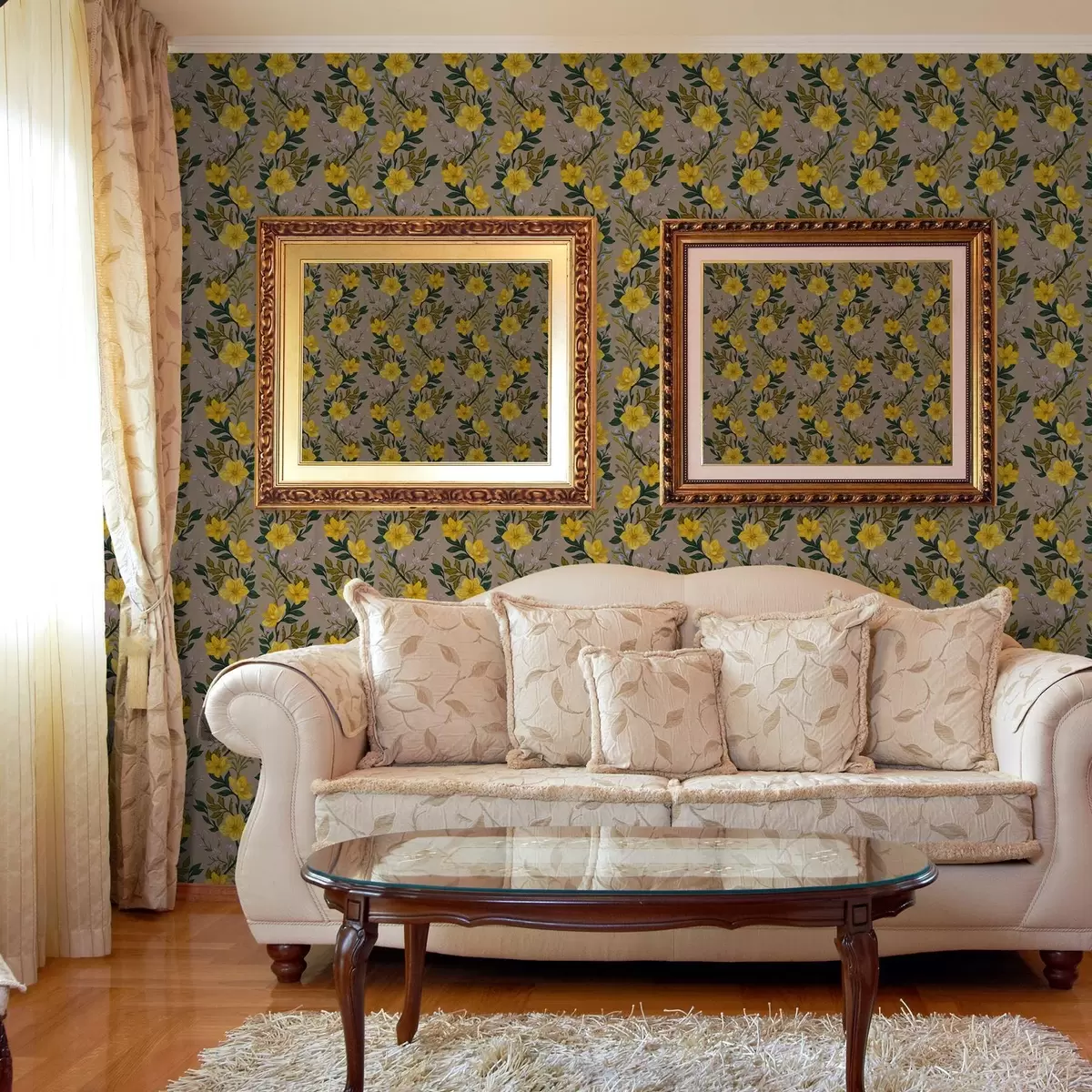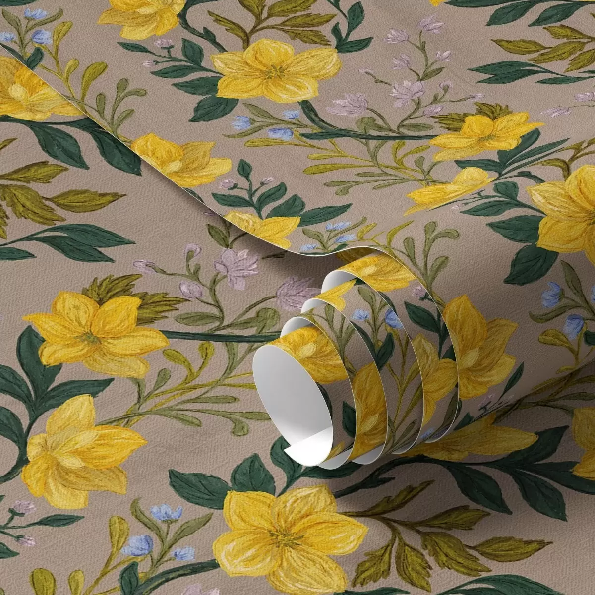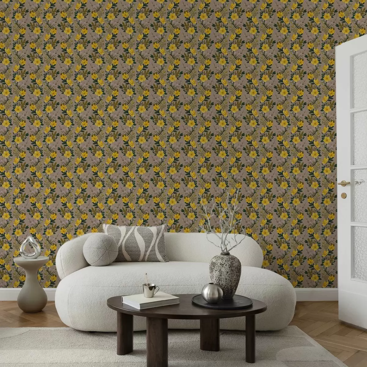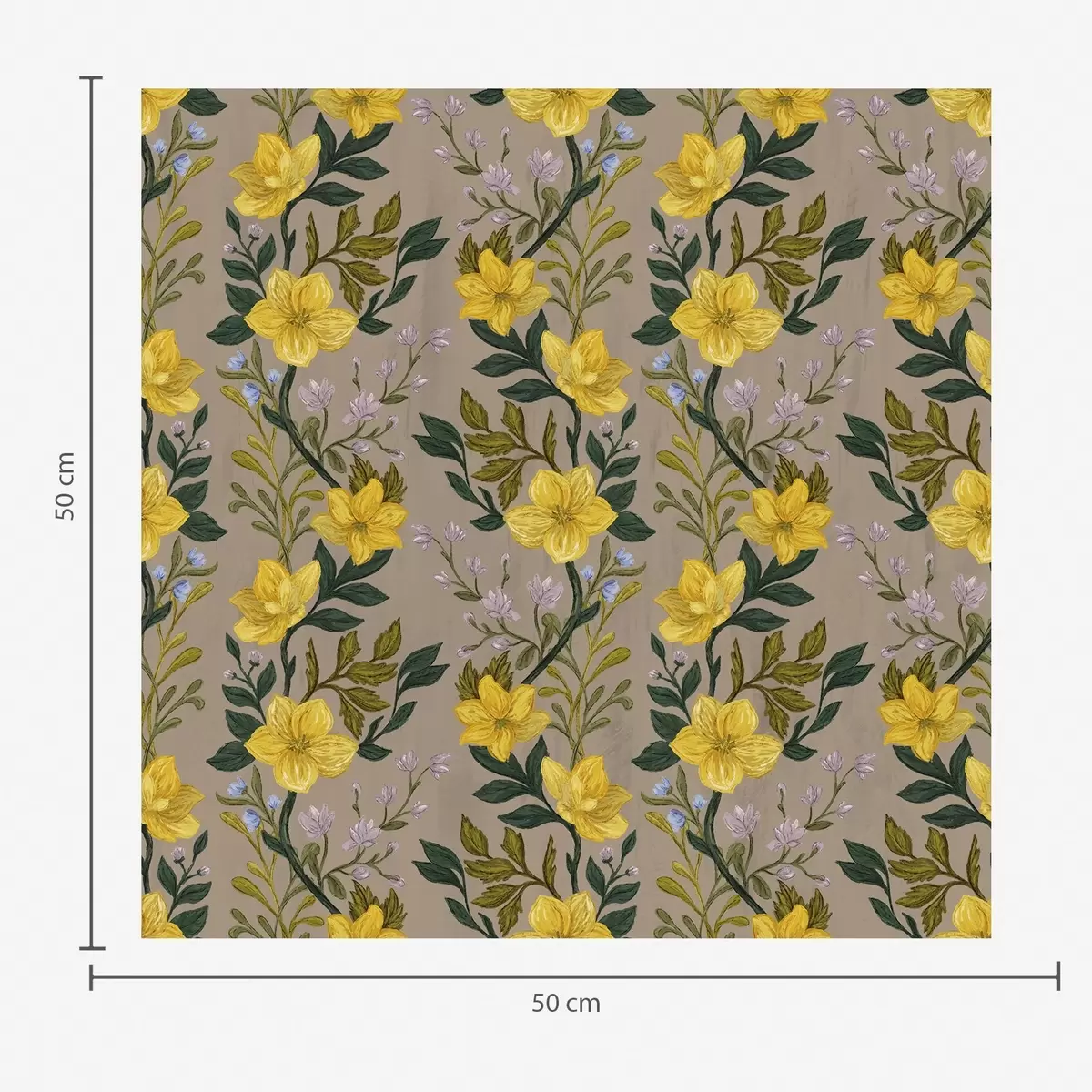 Tapetti Keltaiset kukat pystysuorissa seppeleissä taupe-värisellä taustalla Nr. a00632v1