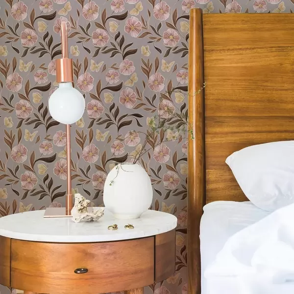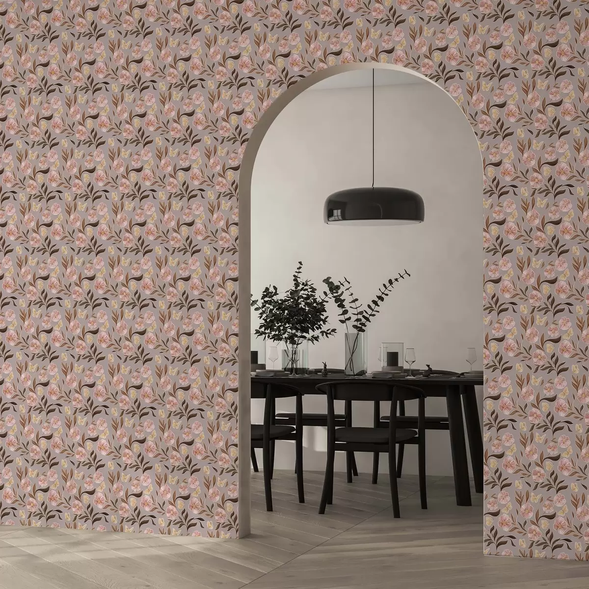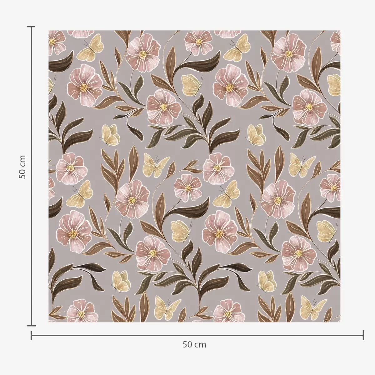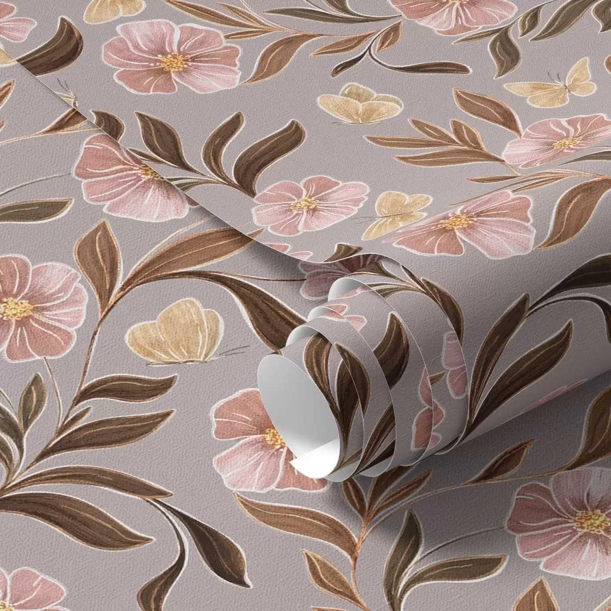 Tapetti Vaaleanpunaiset kukat ja perhoset harmahtavan beigeellä taustalla Nr. a00633