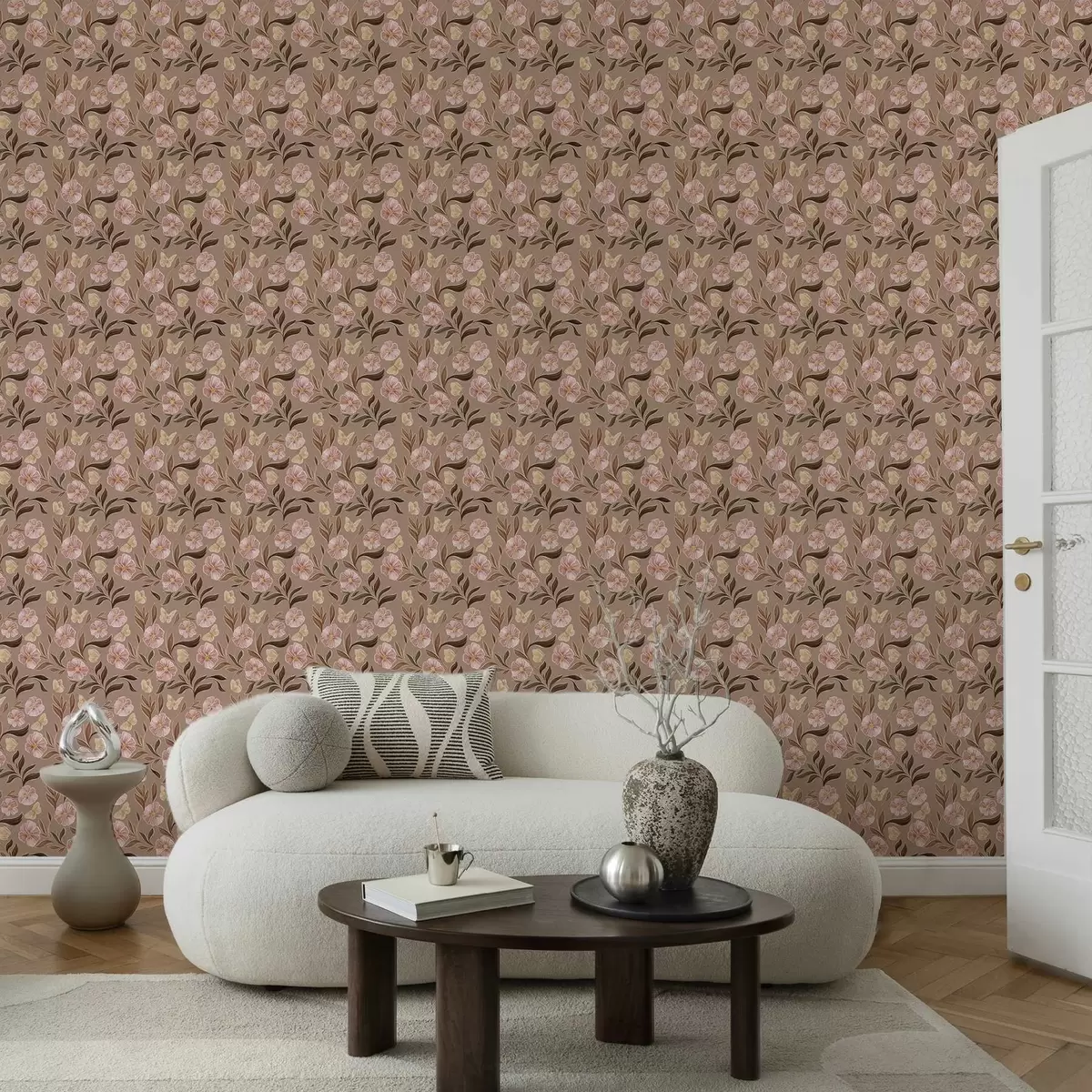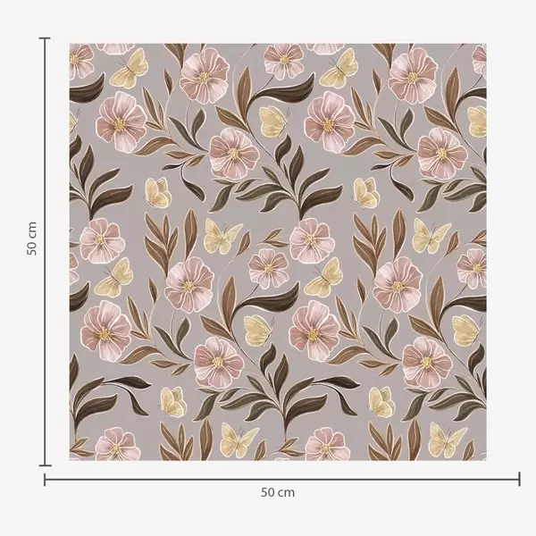 Tapetti Vaaleanpunaiset kukat ja perhoset lämpimällä ruskealla taustalla Nr. a00633v1