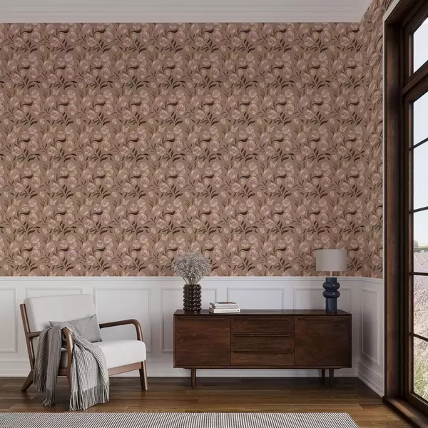 Tapetti Vaaleanpunaiset kukat ja perhoset lämpimällä ruskealla taustalla Nr. a00633v1