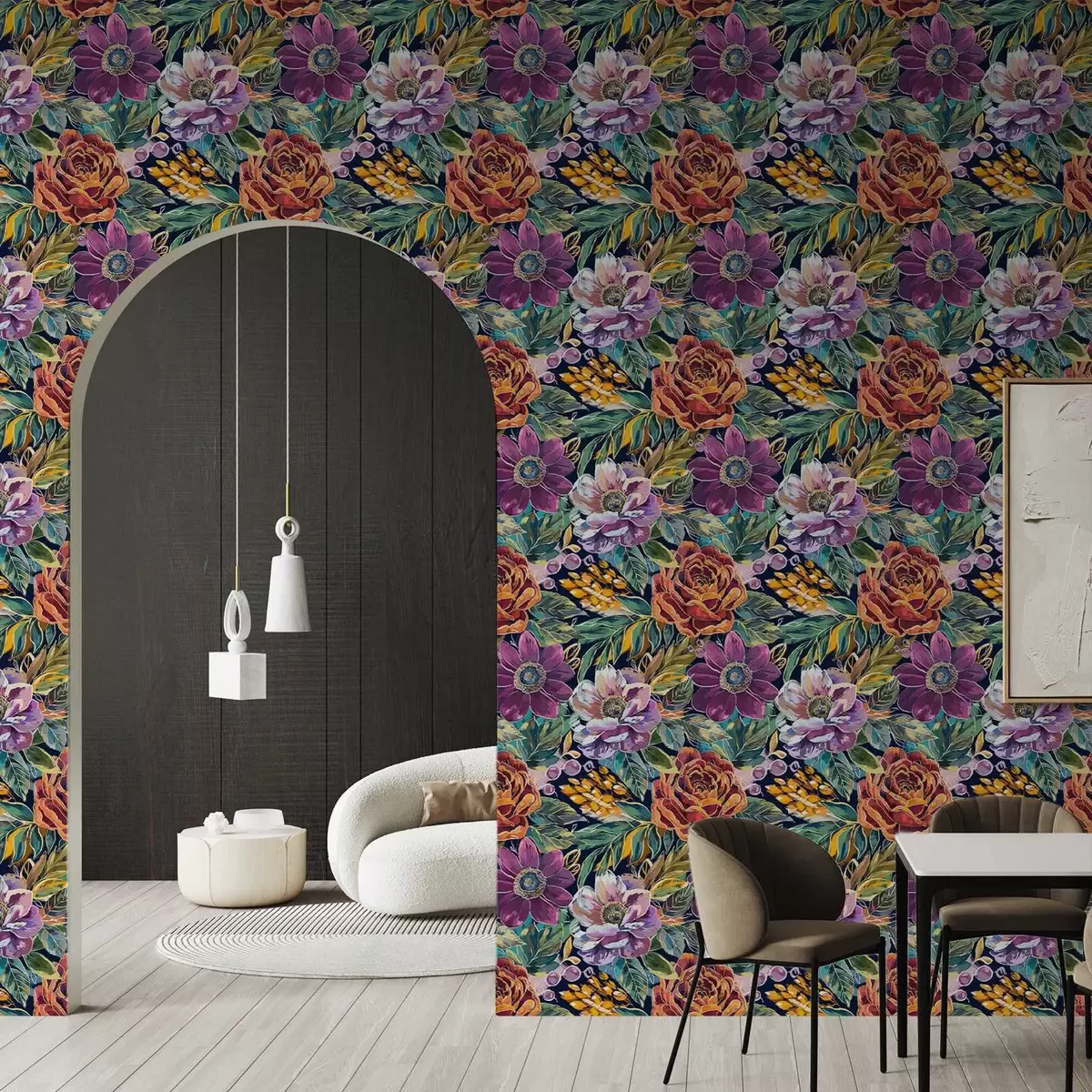 Tapetti Rohkeat, suuret, siveltimellä maalatut kukat tummansinisellä taustalla Nr. a00643
