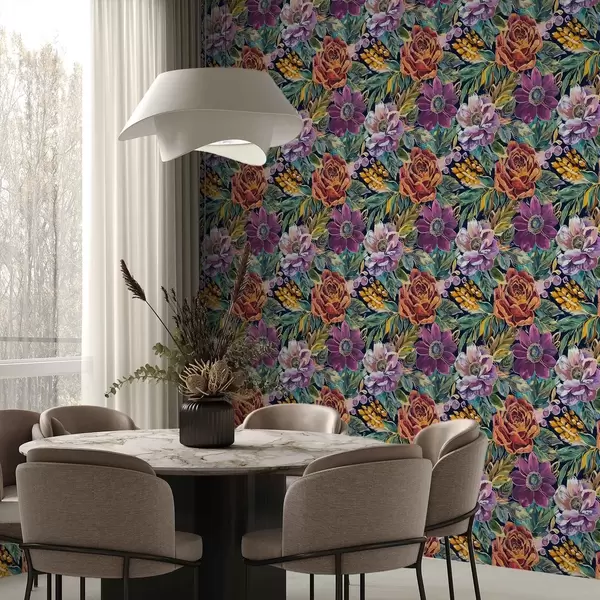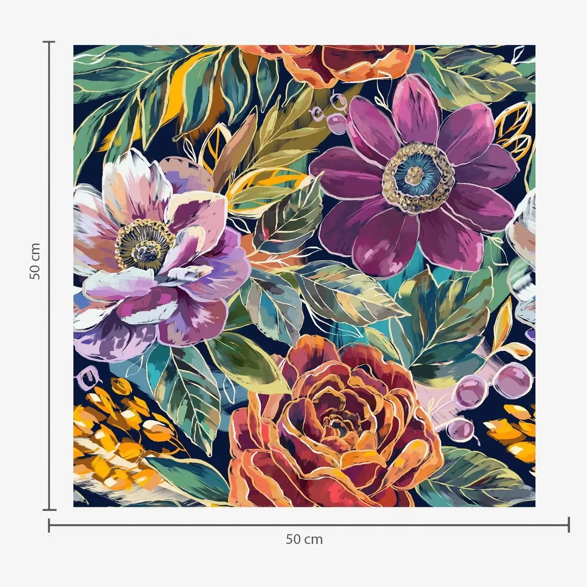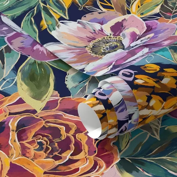Tapetti Rohkeat, suuret, siveltimellä maalatut kukat tummansinisellä taustalla Nr. a00643