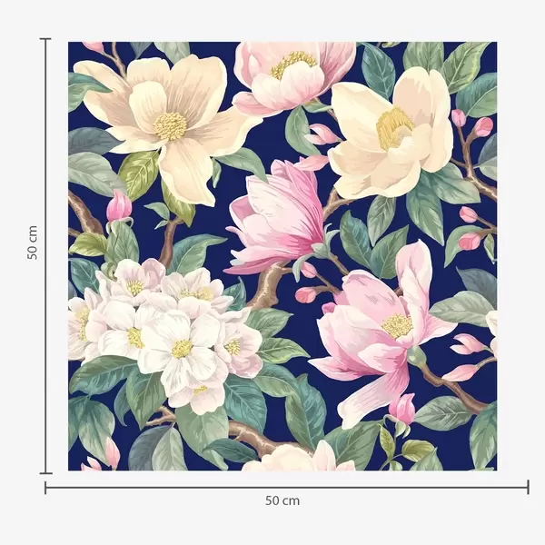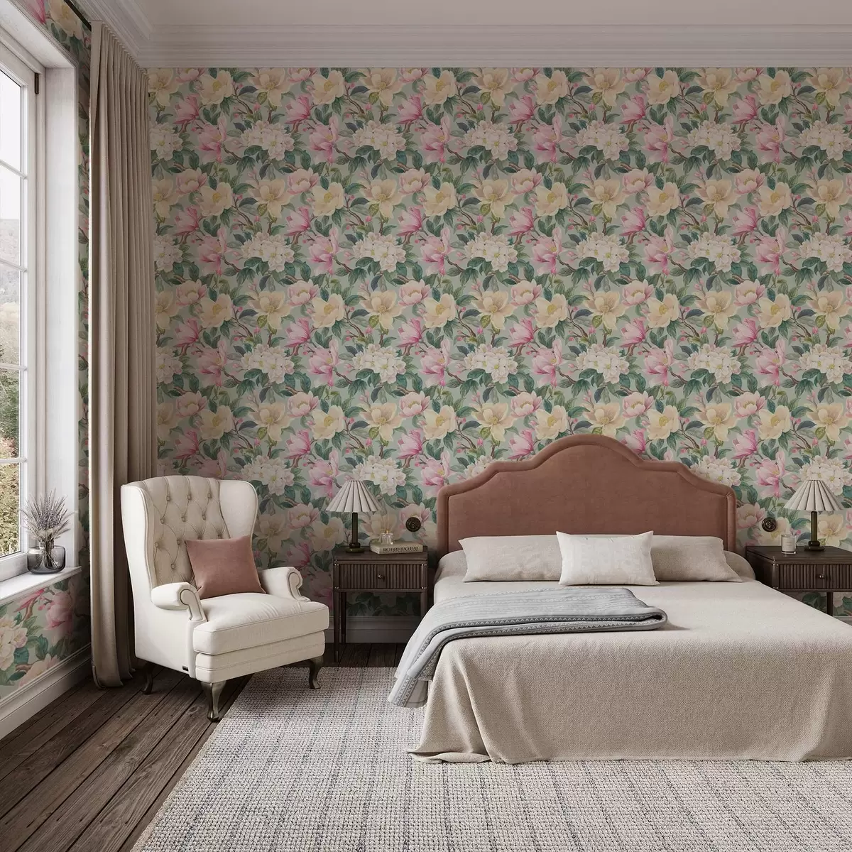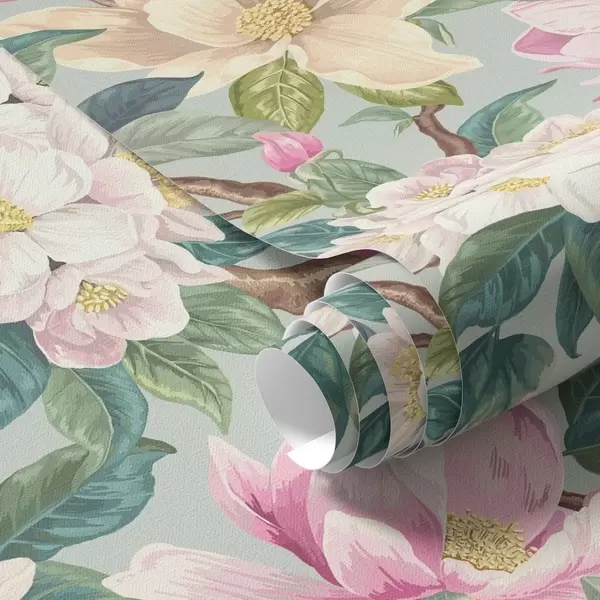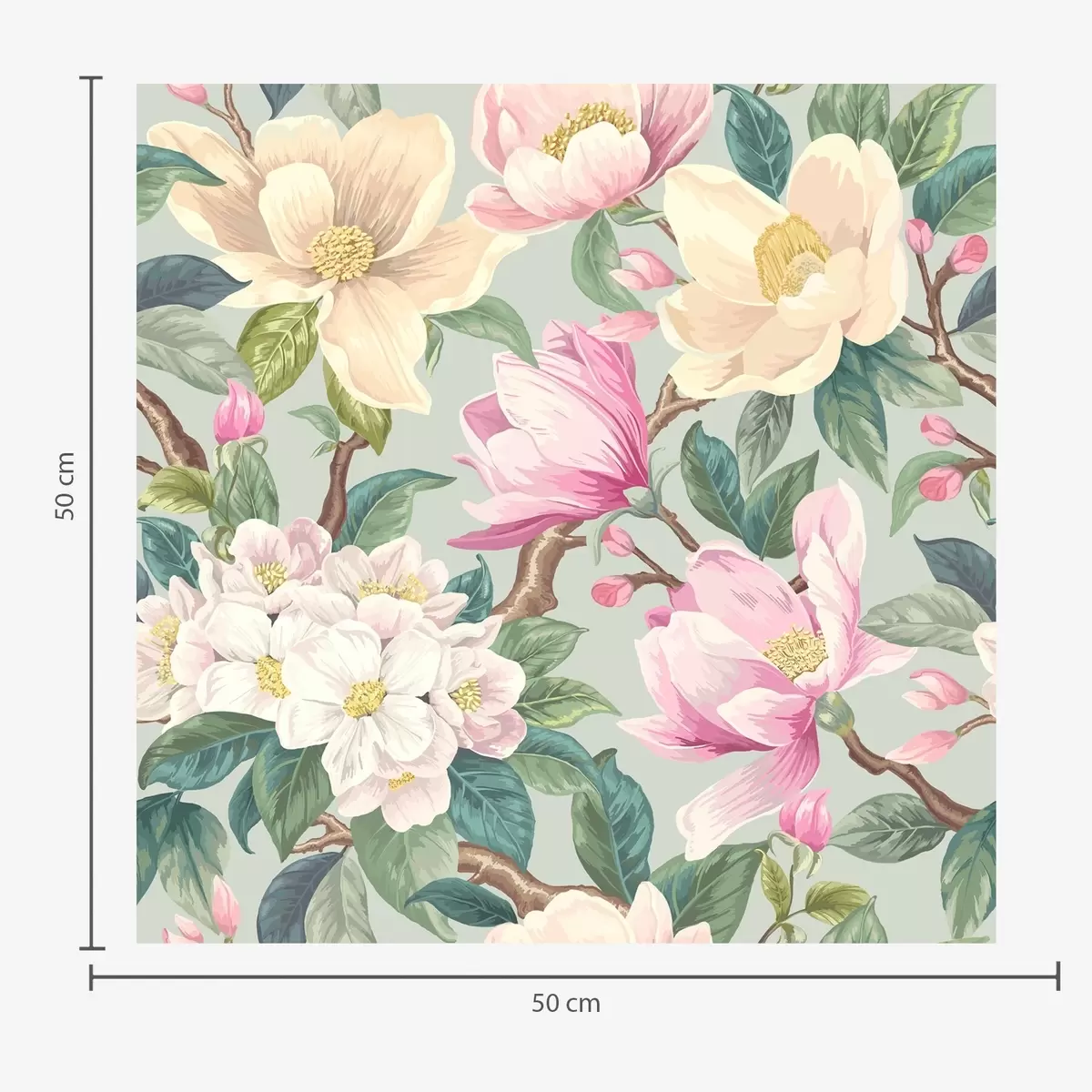 Tapetti Magnoliat ja valkoiset kukat mintunharmaalla taustalla Nr. a00644