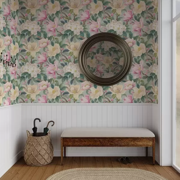 Tapetti Magnoliat ja valkoiset kukat mintunharmaalla taustalla Nr. a00644