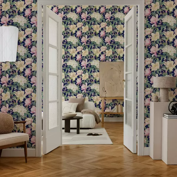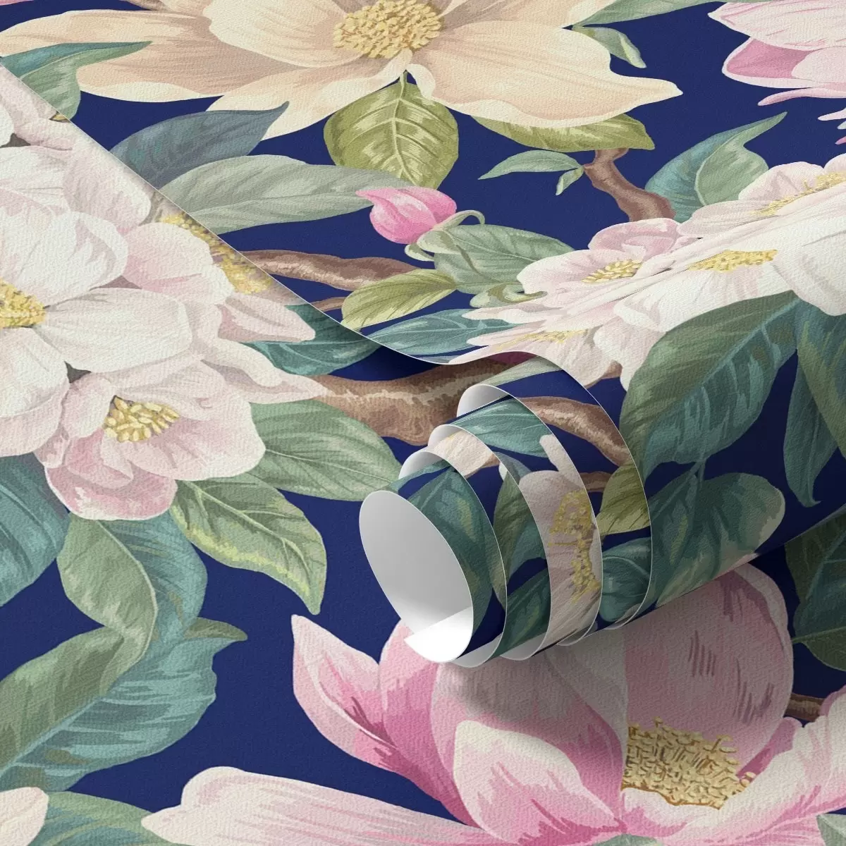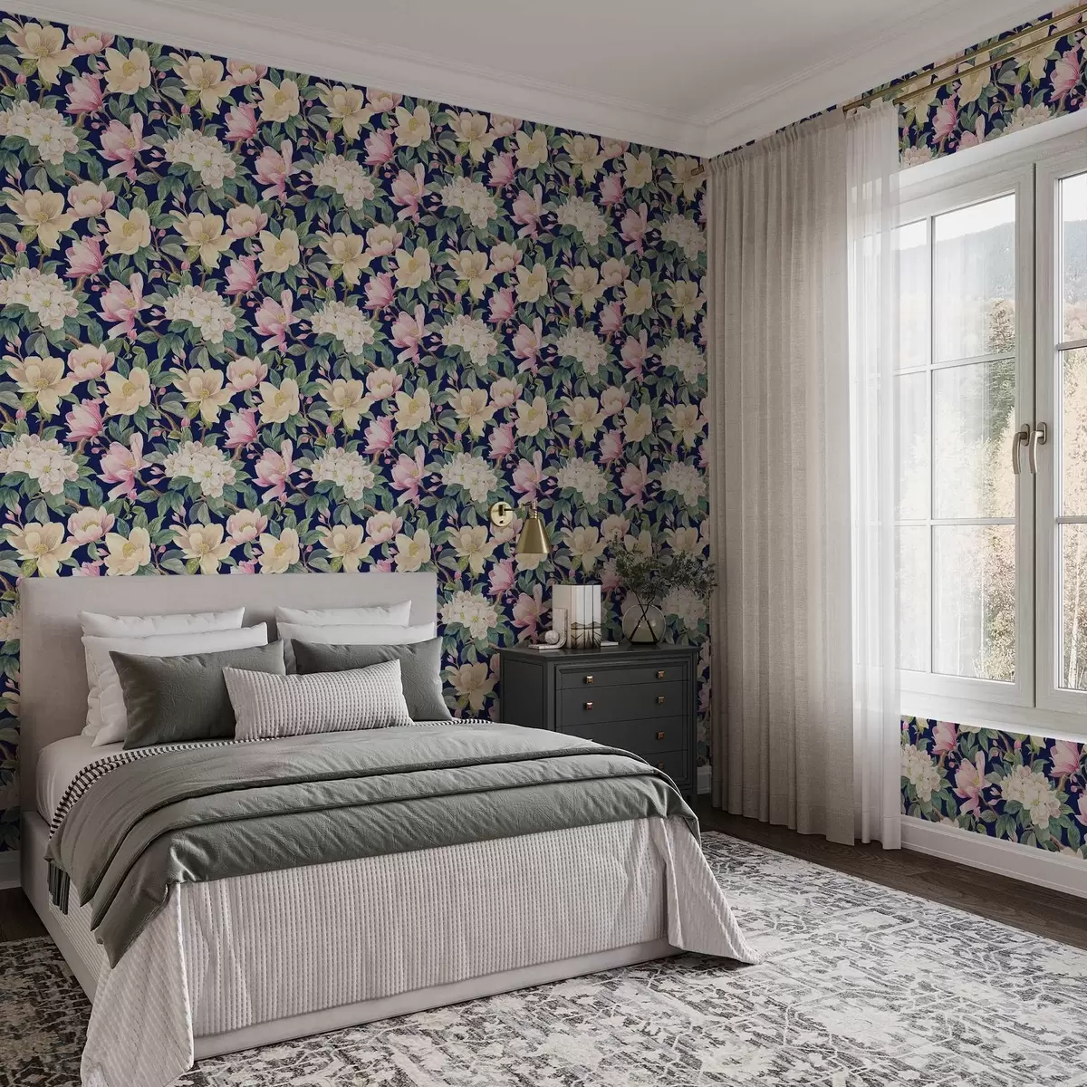 Tapetti Magnoliat ja silmut tummansinisellä taustalla Nr. a00644v1