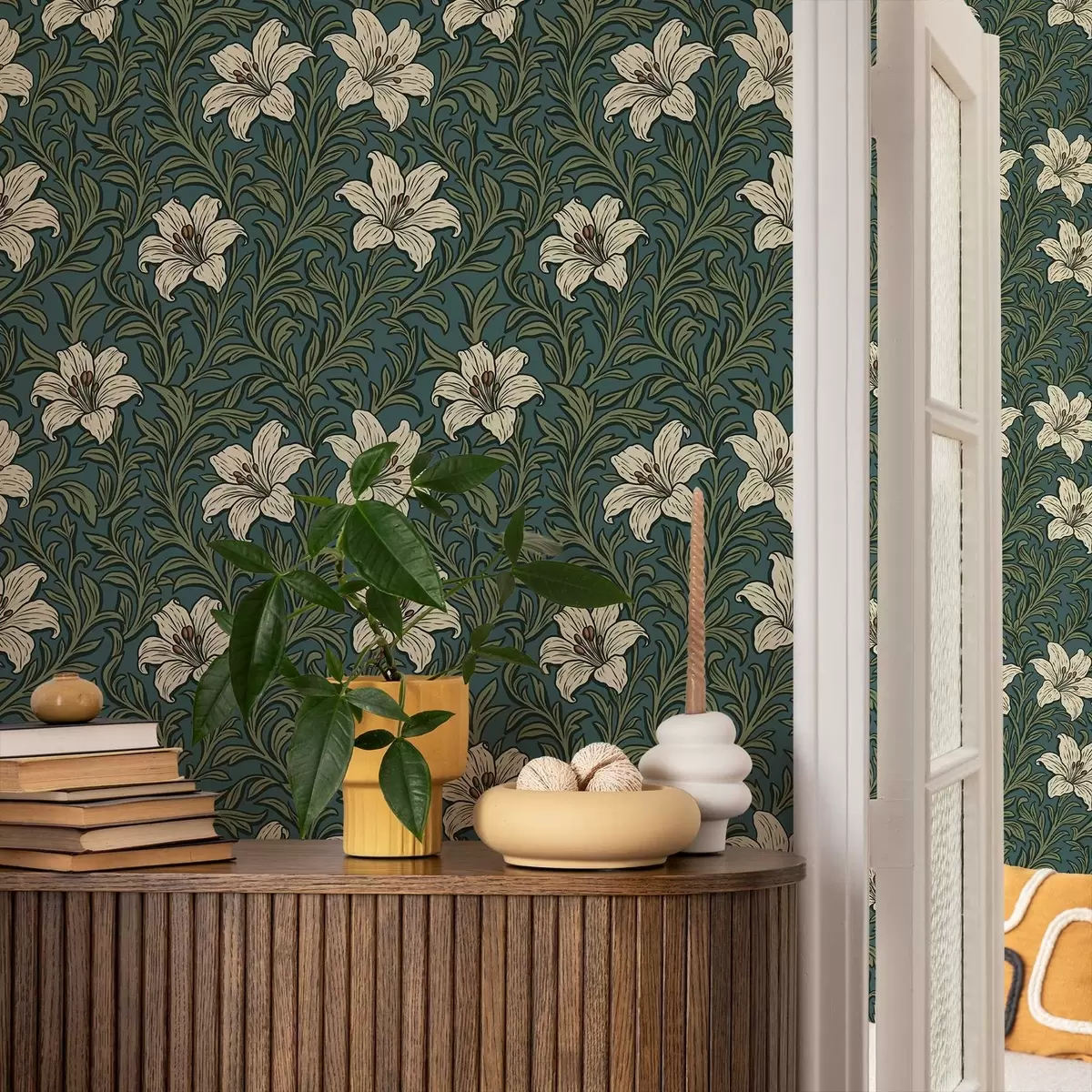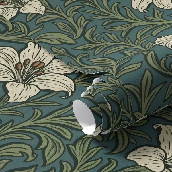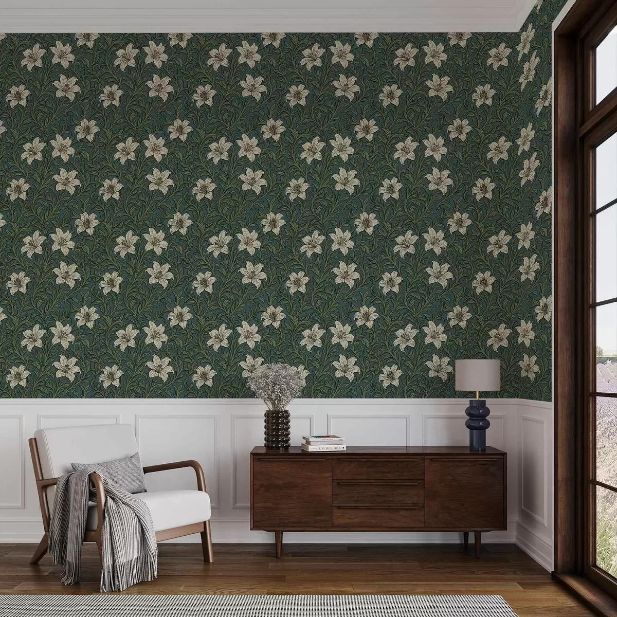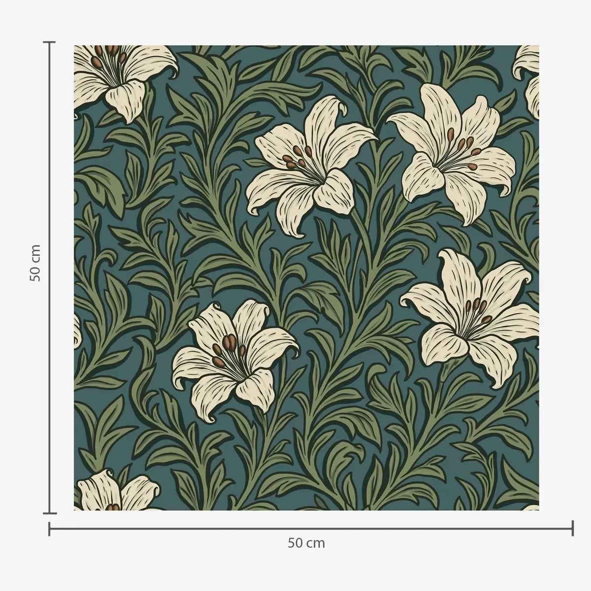 Tapetti Kermanväriset liljat tiheän vehreyden keskellä turkoosilla taustalla Nr. a00645