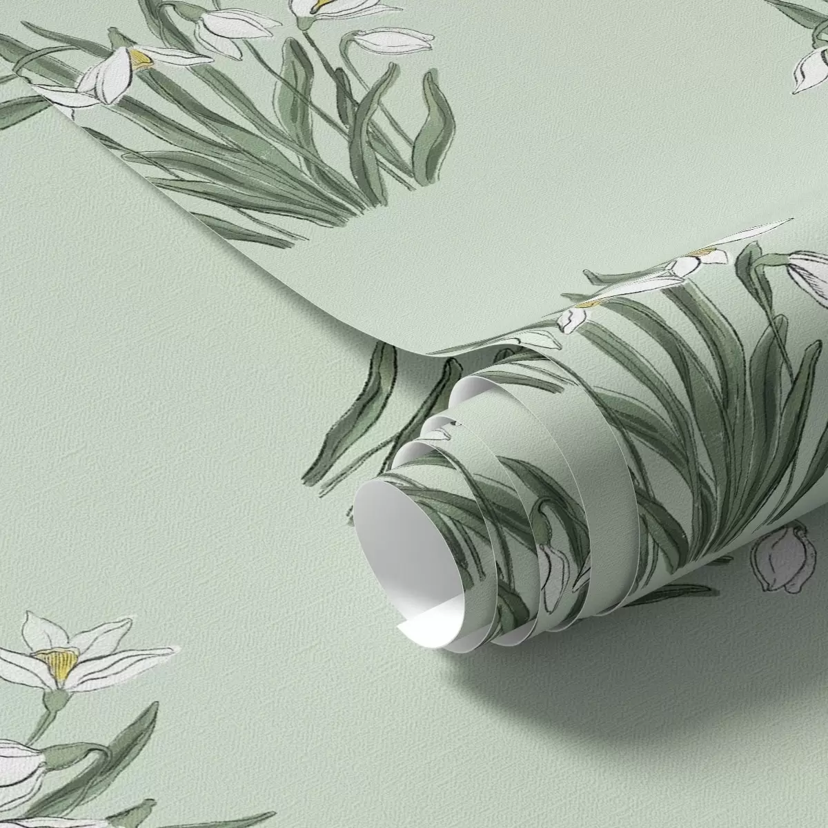 Tapetti Lumikellot vihreillä lehdillä lämpimällä keltaisella taustalla Nr. a00651v3