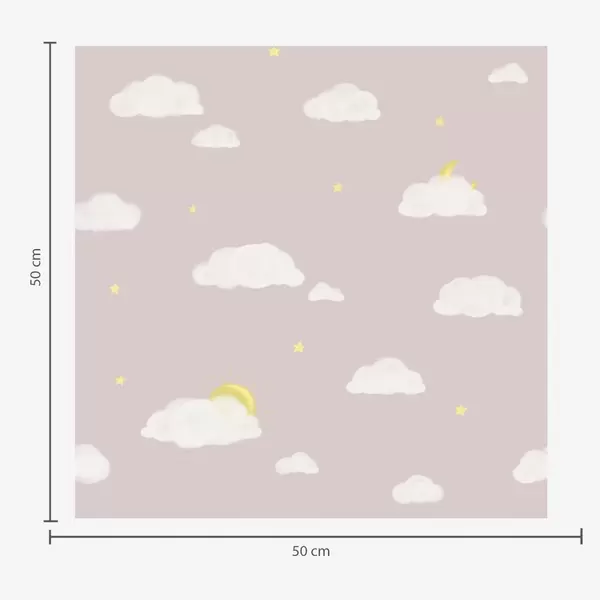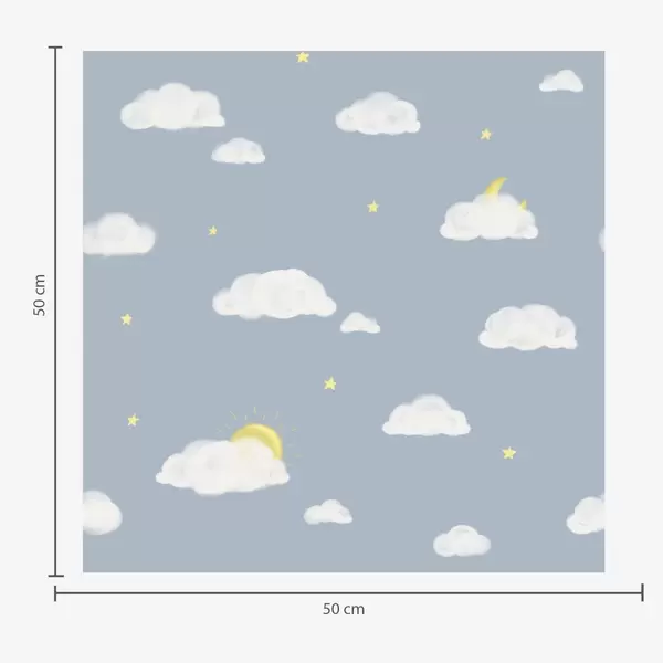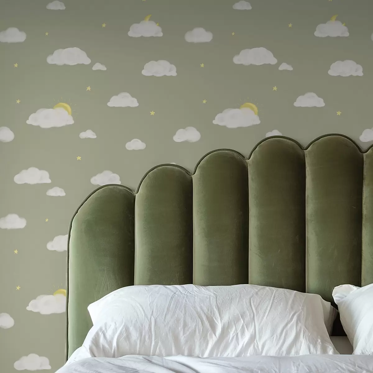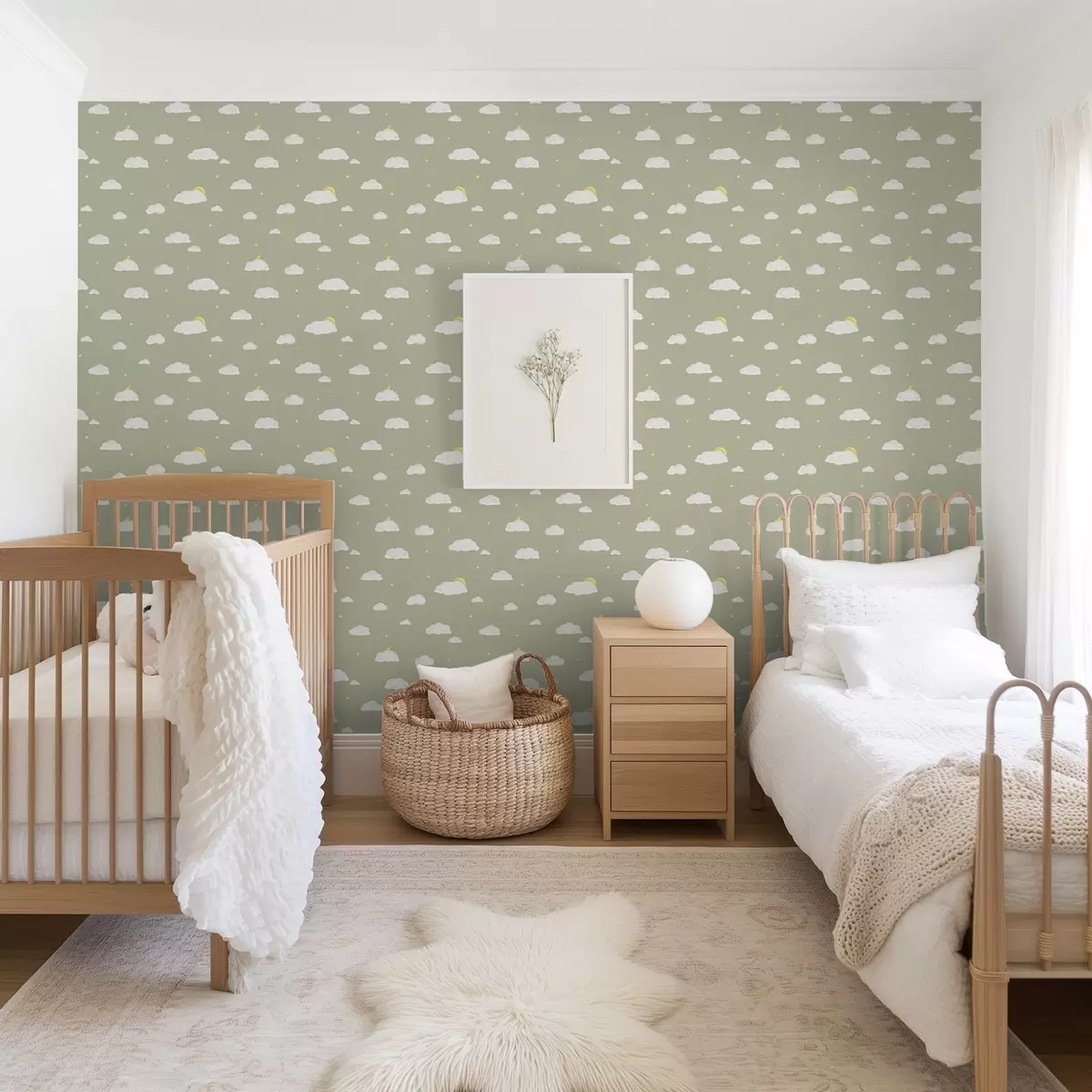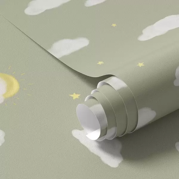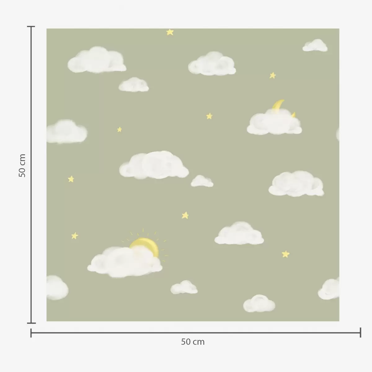 Tapetti Pehmeät pilvet, tähdet ja aurinko vihertävän harmaalla taustalla Nr. a00652v1