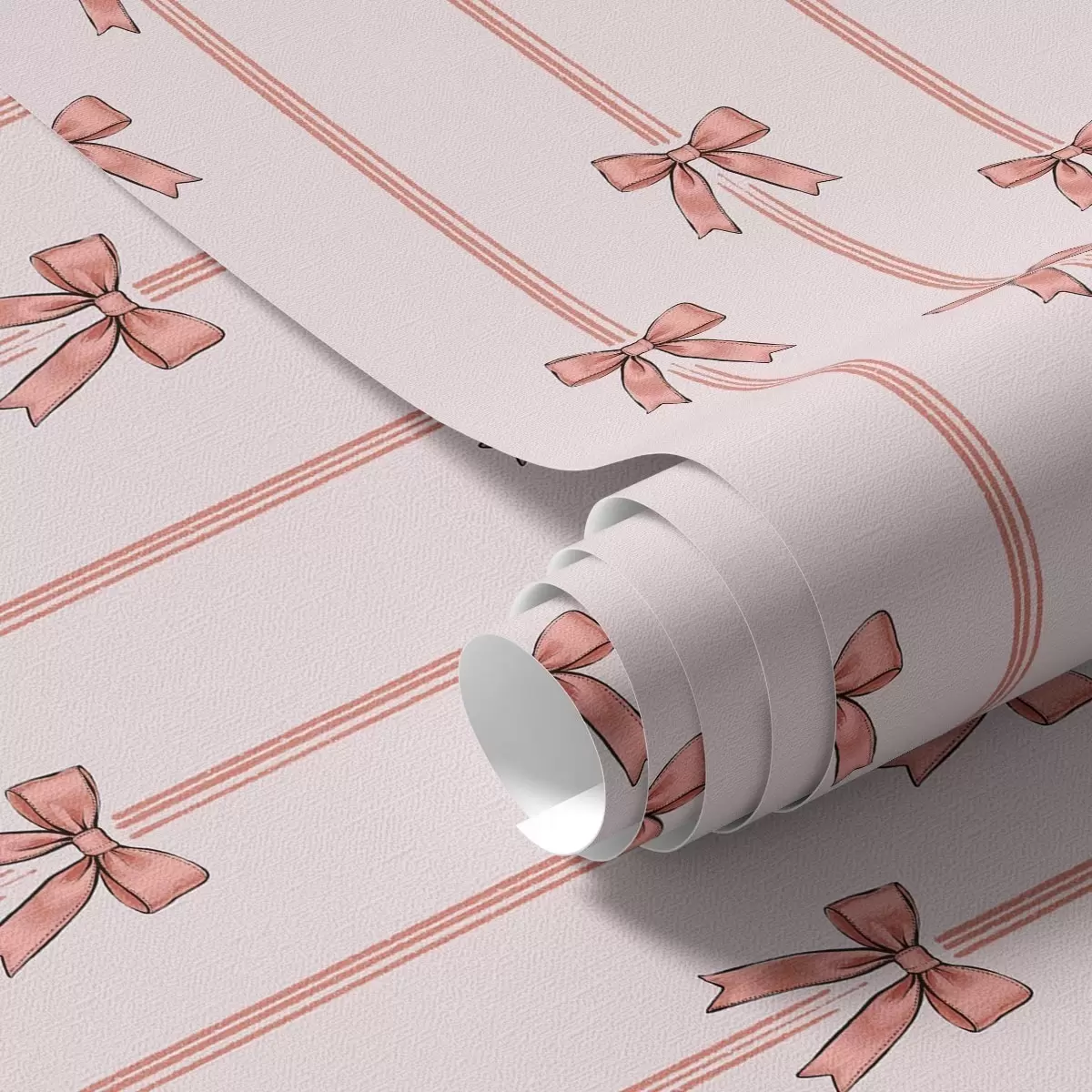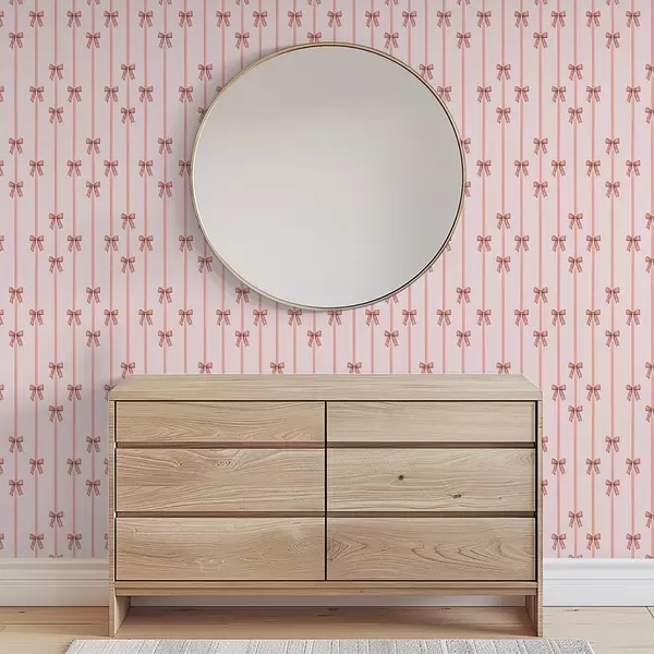 Tapetti Pystysuuntaiset nauhat ruseteilla, vaaleanpunainen tausta Nr. a00653v2