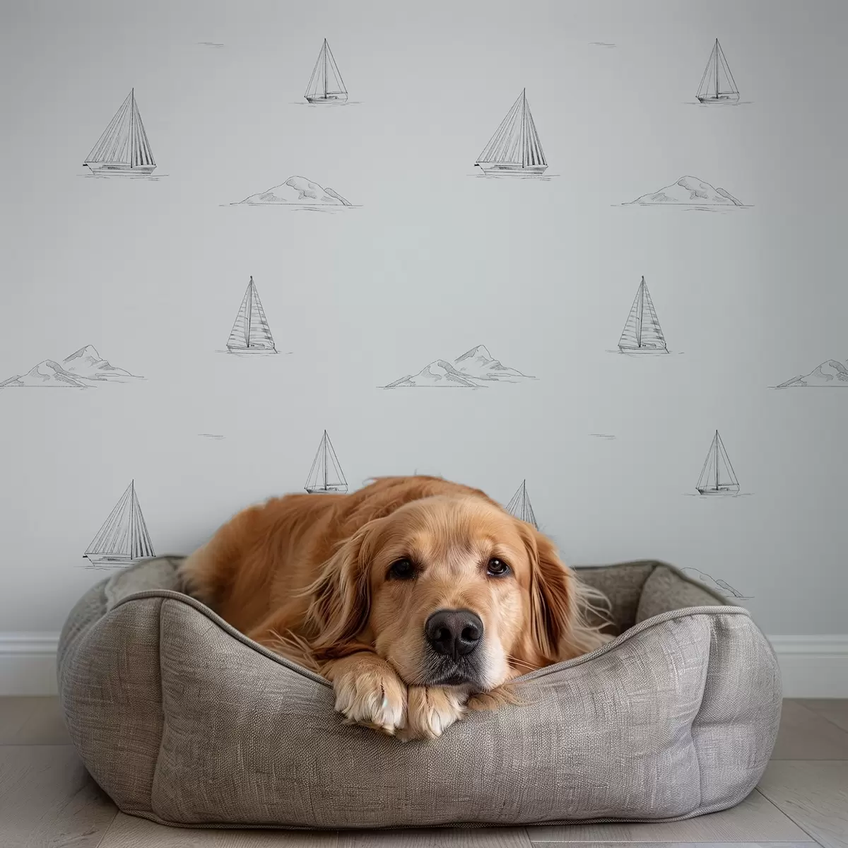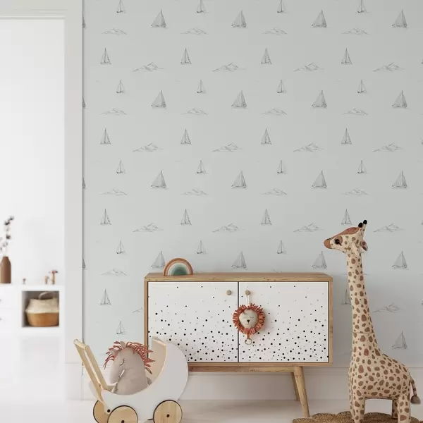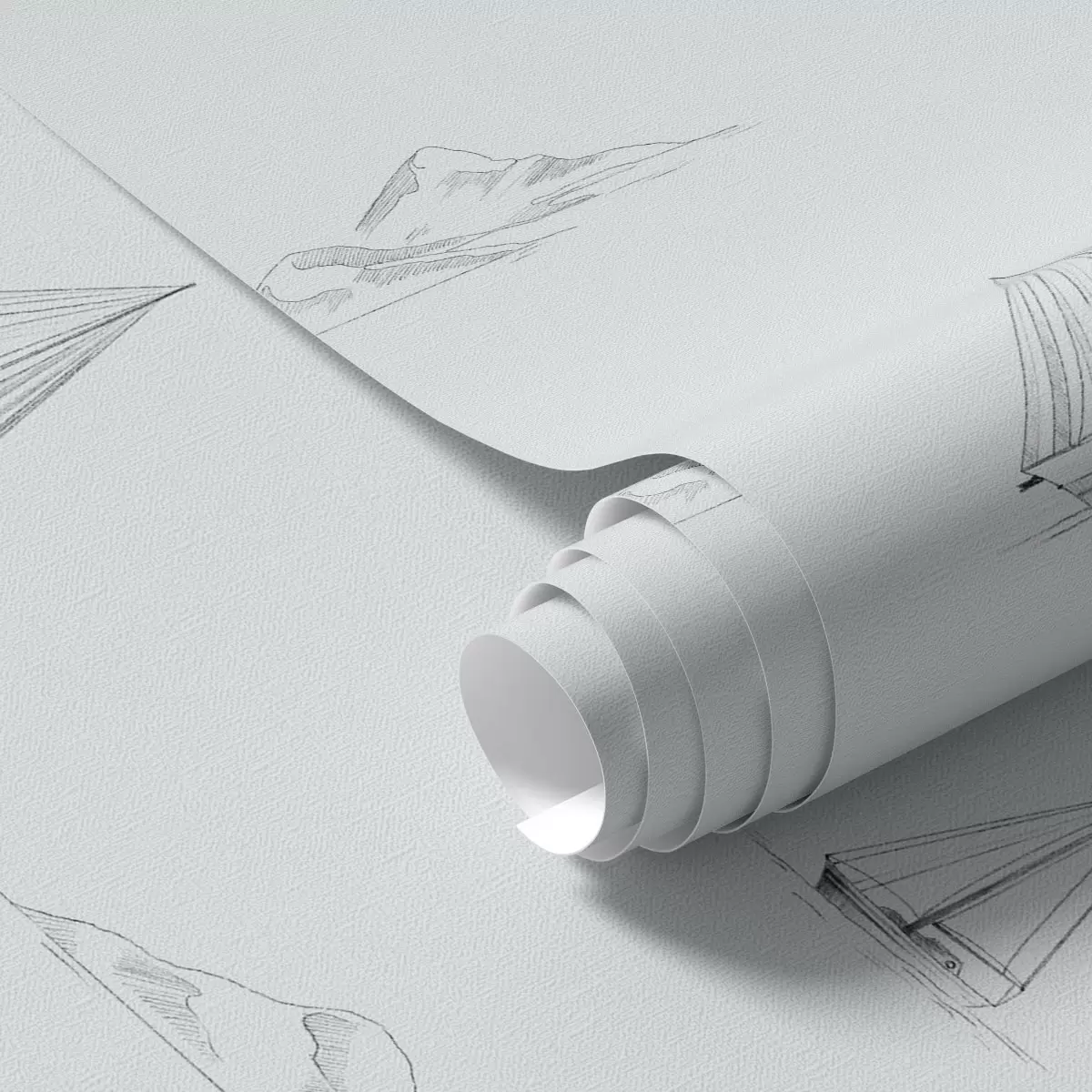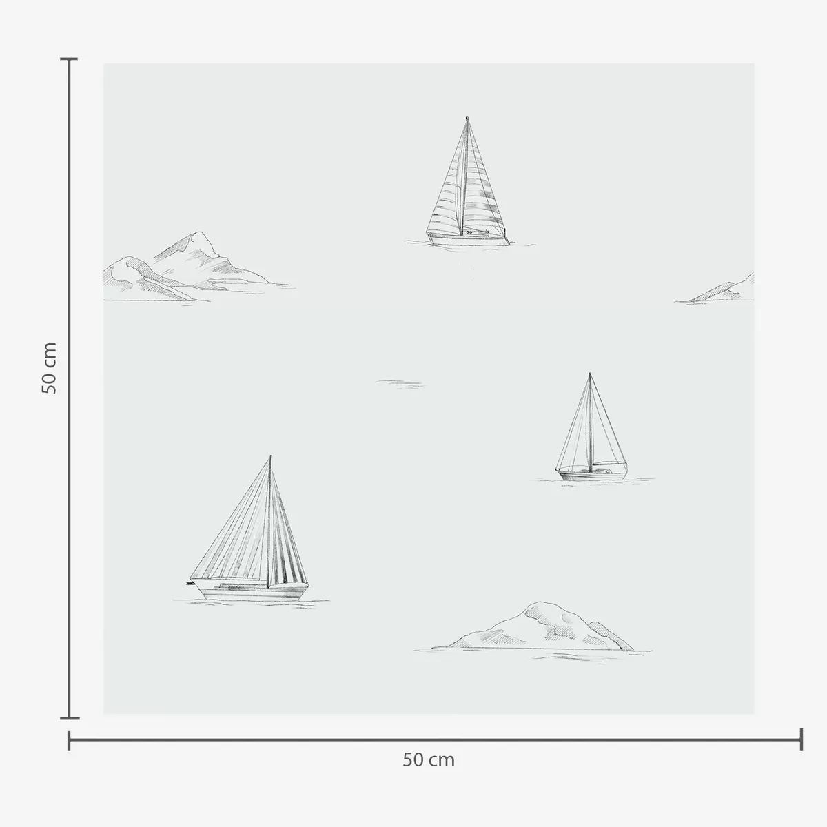Tapetti Piirrä purjeveneitä ja saaria, viileä sinisenharmaa tausta Nr. a00654