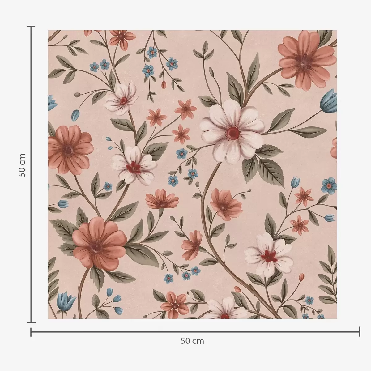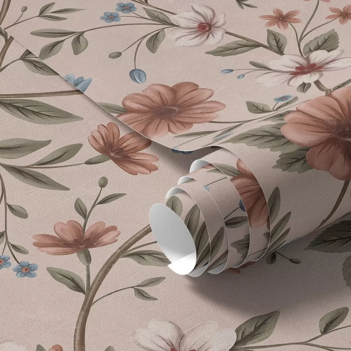 Tapetti Vaaleanpunaiset korallikukat ja lehdet pölyisen vaaleanpunaisella pohjalla Nr. a00667