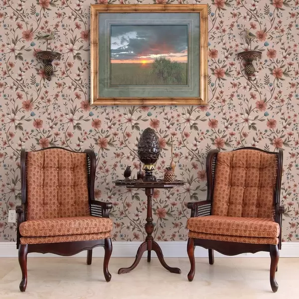Tapetti Vaaleanpunaiset korallikukat ja lehdet pölyisen vaaleanpunaisella pohjalla Nr. a00667