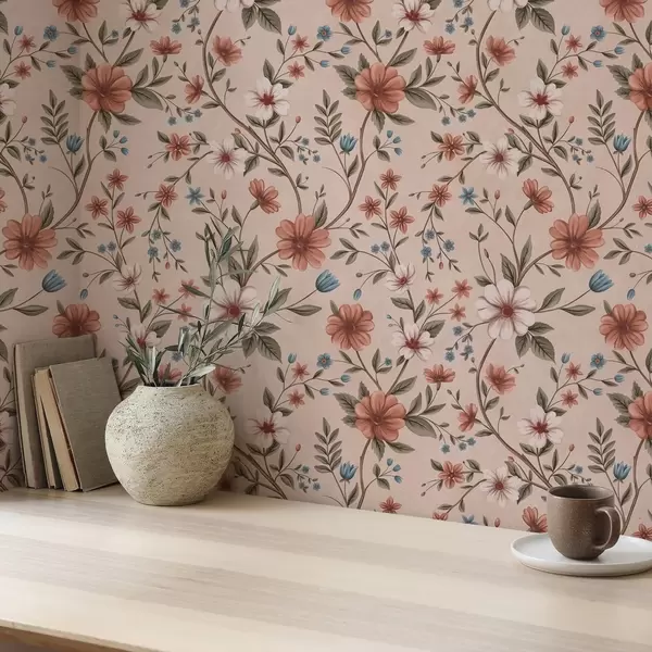 Tapetti Vaaleanpunaiset korallikukat ja lehdet pölyisen vaaleanpunaisella pohjalla Nr. a00667