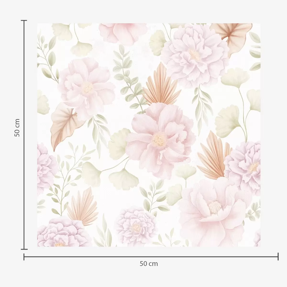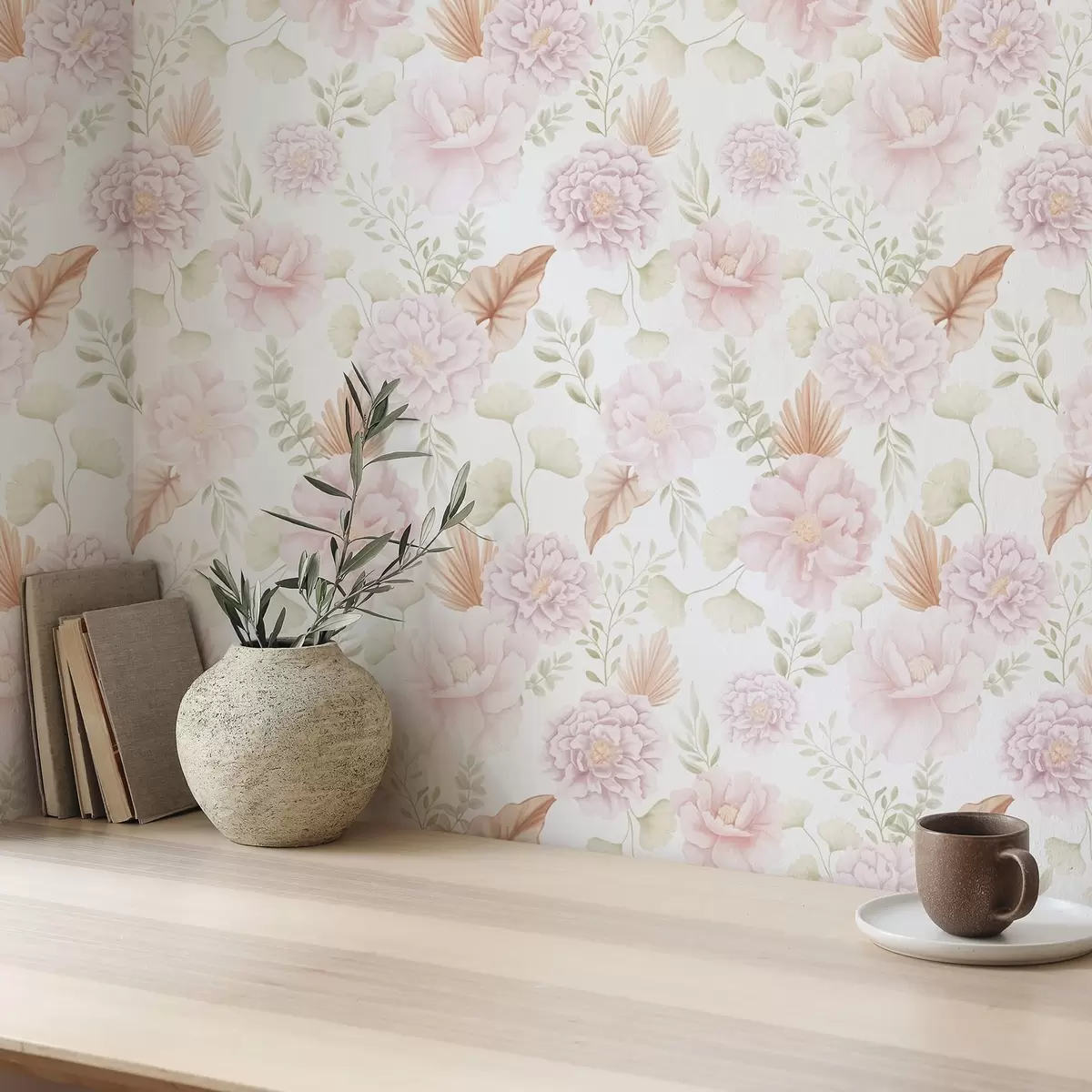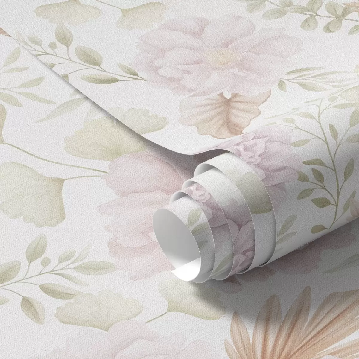 Tapetti Pehmeät pastellivärit, pionit ja lehdet valkoisella taustalla Nr. a00669
