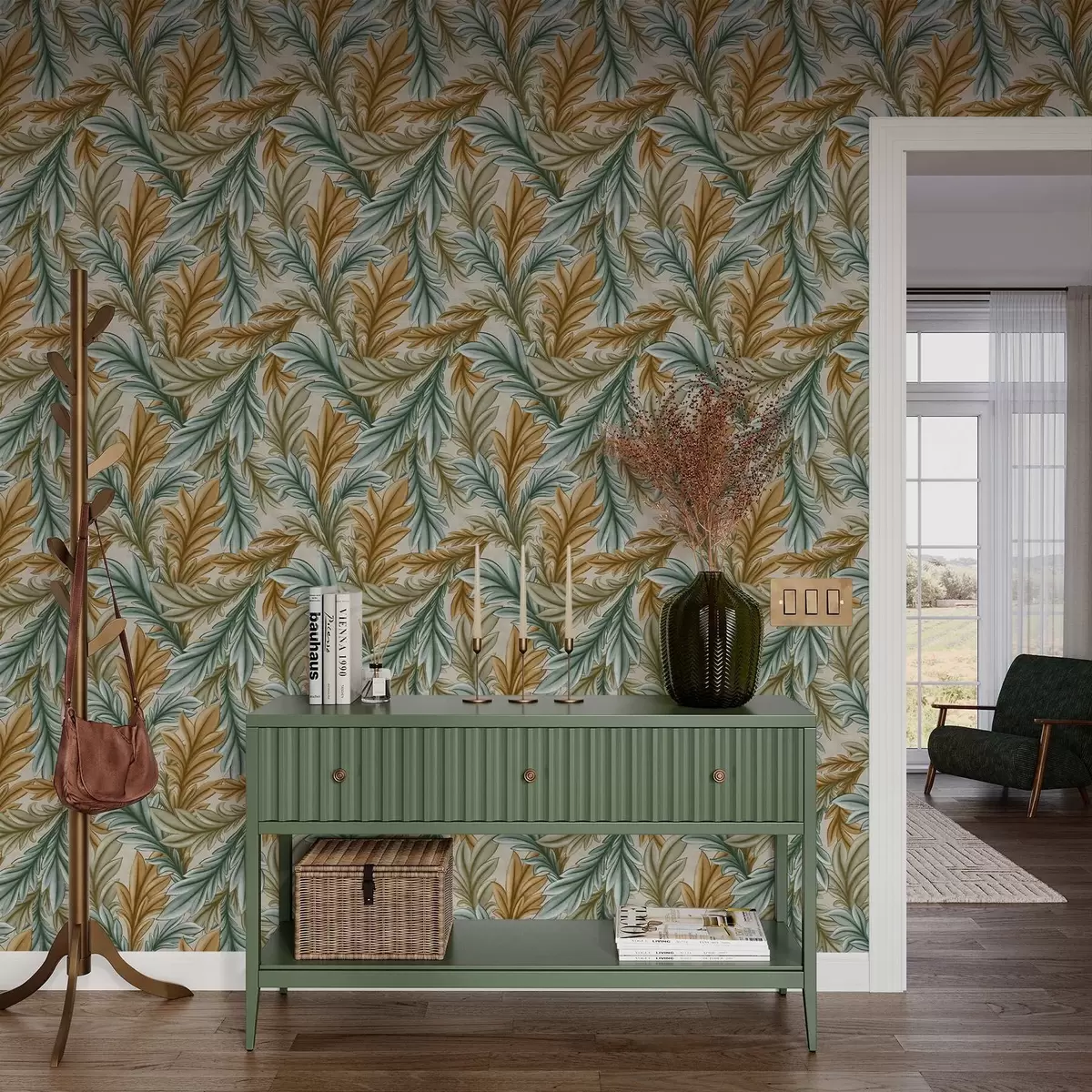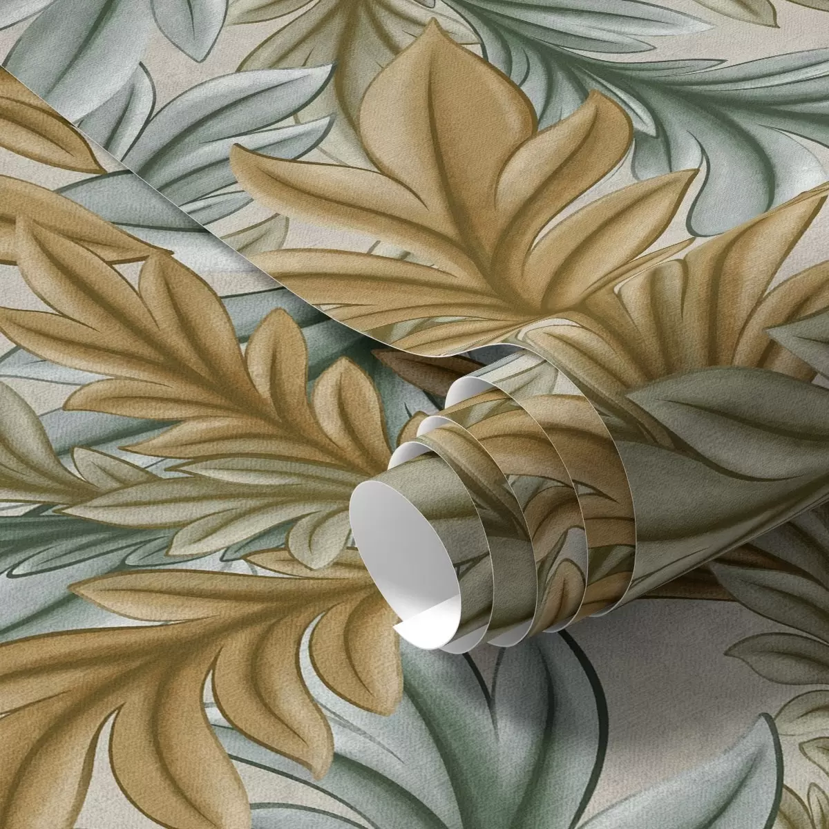 Tapetti Koristeellinen lehtien lämpimät okra- ja vihreäsävyt Nr. a00673