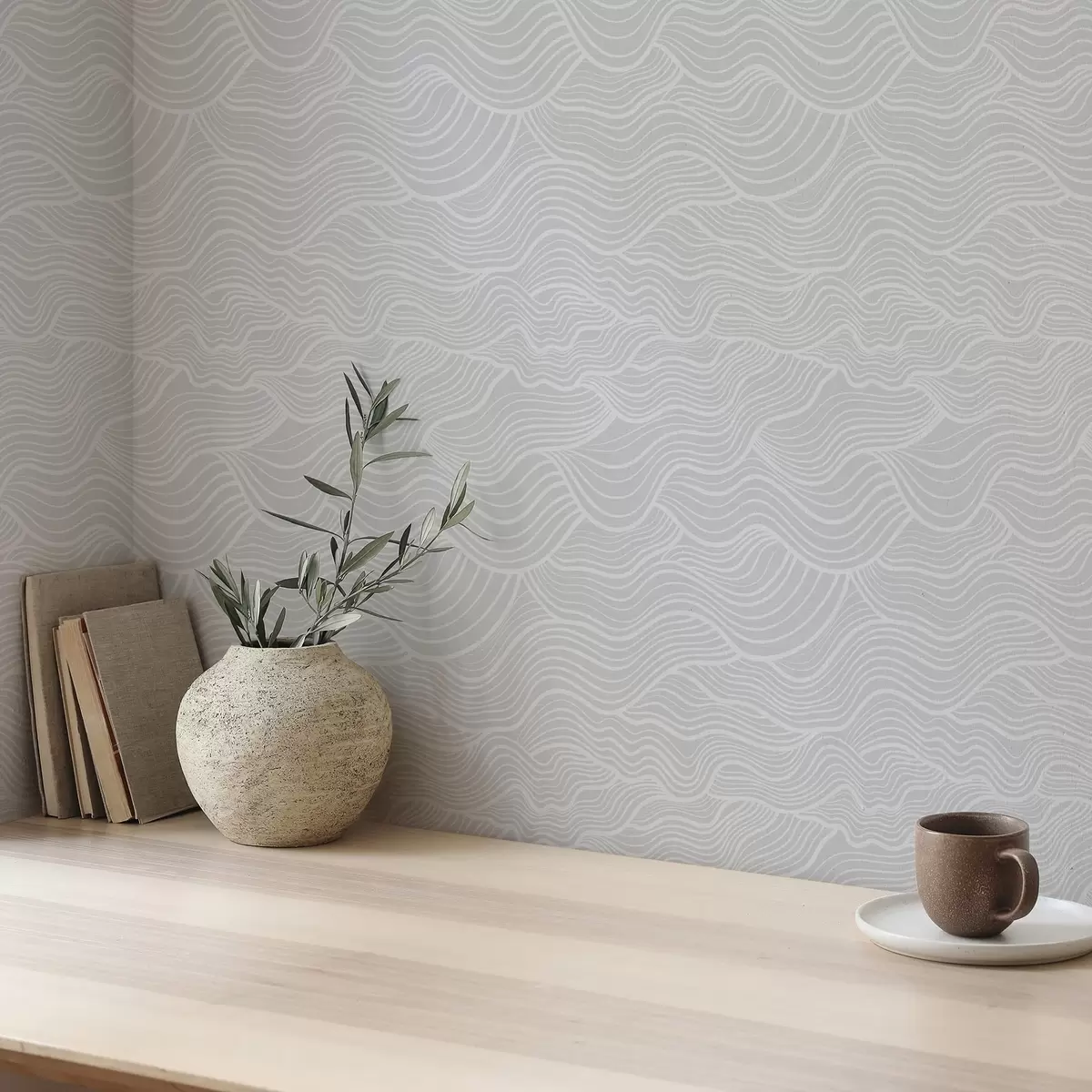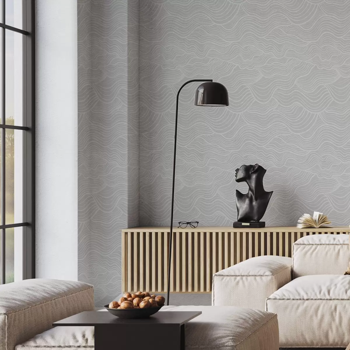 Tapetti Aaltoileva koriste: vaaleat viivat harmaalla taustalla Nr. a00681v2