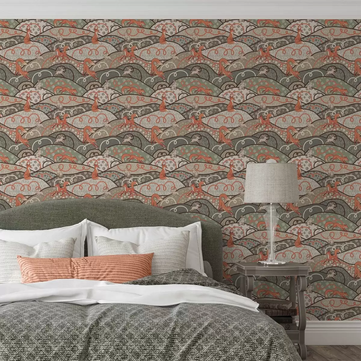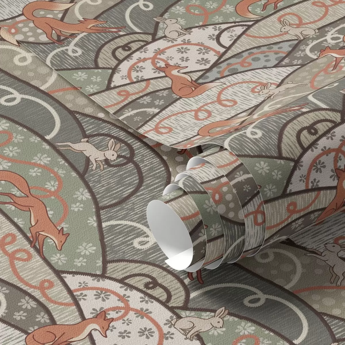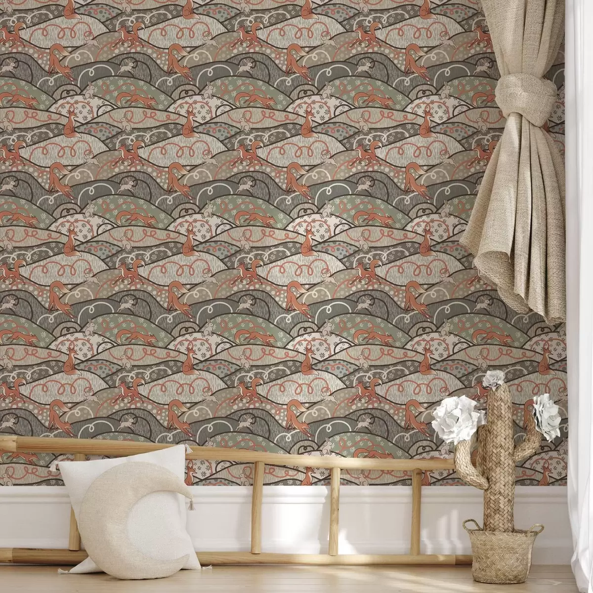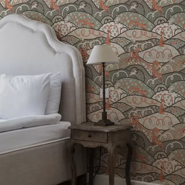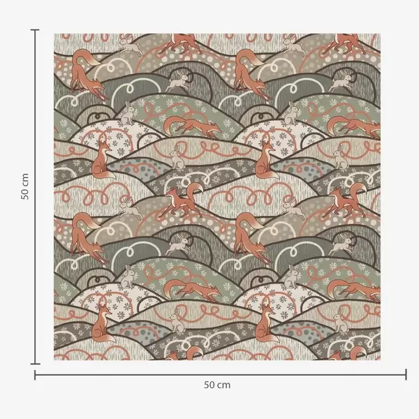 Tapetti Kettuja ja jäniksiä aaltoilevilla kukkuloilla, retrokuvio Nr. a00690