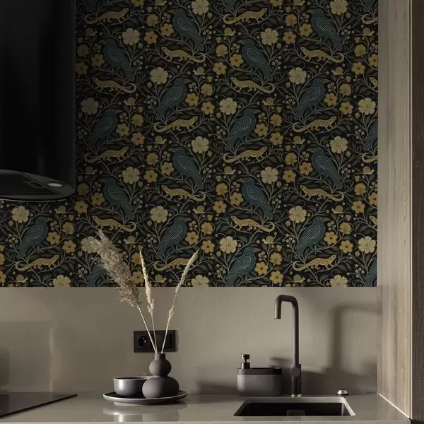 Tapetti Linnut, liskot ja etanat kukkien keskellä tummalla taustalla Nr. a00691