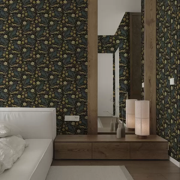 Tapetti Linnut, liskot ja etanat kukkien keskellä tummalla taustalla Nr. a00691
